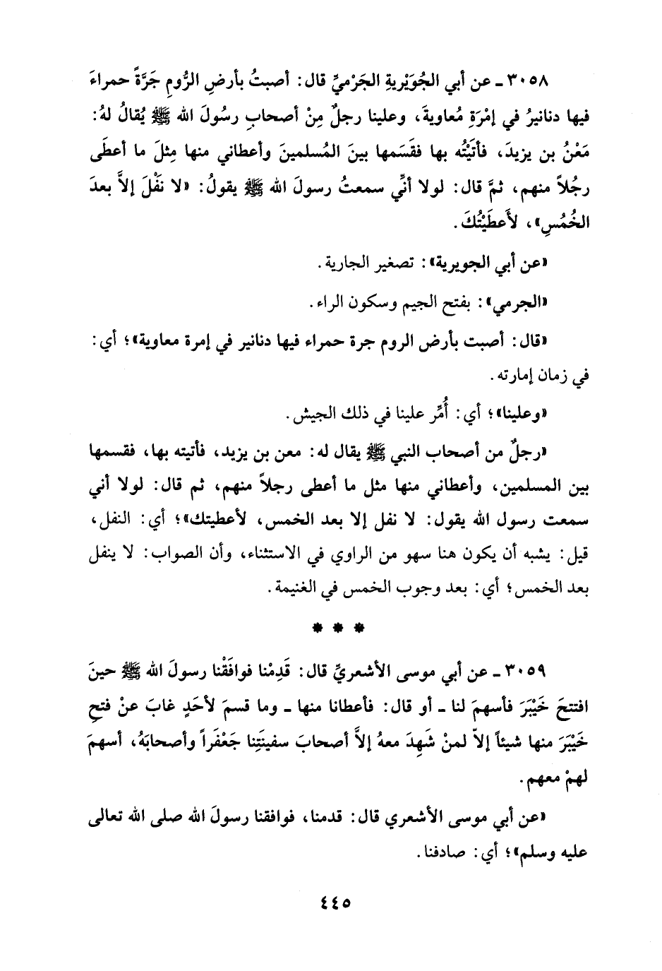 3058 - عن أبي الجُويريةِ الجَرْميِّ قال: أصبتُ بأرضِ الرُّومِ جَرَّةً حمراءَ فيها دنانيرُ في إمْرَةِ مُعاويةَ، وعلينا رجلٌ مِنْ أصحابِ رسُولَ الله - صلى الله عليه وسلم - يُقالُ لهُ: مَعْنُ بن يزيدَ، فأتَيْتُه بها فقَسَمها بينَ المُسلمينَ وأعطاني منها مِثلَ ما أعطَى رجُلاً منهم، ثمَّ قال: لولا أنِّي سمعتُ رسولَ الله - صلى الله عليه وسلم - يقولُ: "لا نَفْلَ إلَّا بعدَ الخُمُسِ"، لأَعطَيْتُكَ.