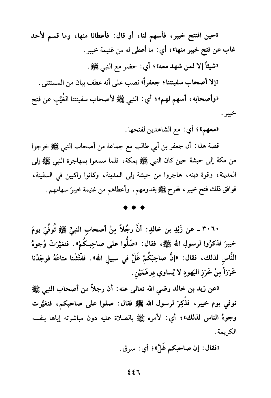 3060 - عن زيدِ بن خالدٍ: أنَّ رجُلًا مِنْ أصحابِ النبيِّ - صلى الله عليه وسلم - تُوفِّيَ يومَ خيبرَ فذكرُوا لرسولِ الله - صلى الله عليه وسلم -، فقال: "صَلُّوا على صاحِبكُمْ". فتغيَّرَتْ وُجوهُ النَّاسِ لذلك، فقال: "إنَّ صاحِبَكُمْ غَلَّ في سبيلِ الله". ففتَّشْنا متاعَهُ فوجَدْنا خَرَزًا مَنْ خَرَزِ اليَهودِ لا يُساوي دِرهَمَيْنِ.