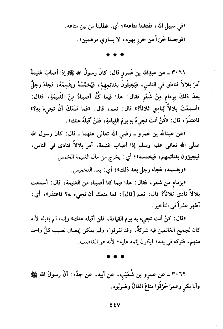 3061 - عن عبدِ الله بن عَمروٍ قال: كانَ رسولُ الله - صلى الله عليه وسلم - إذا أصابَ غنيمةً أمرَ بلالاً فنادَى في الناسِ، فيَجيئُون بغنائِمِهِمْ، فيُخمِّسُهُ ويقْسِمُهُ، فجاءَ رجلٌ بعدَ ذلكَ بزِمامٍ مِنْ شَعْرٍ فقال: هذا فيما كُنَّا أصبناهُ مِنَ الغَنيمَةِ، فقال: "أسمِعْتَ بلالاً يُنادِي ثلاثًا؟ " قال: نعم، قال: "فما مَنَعَكَ أنْ تجيءَ بهِ؟ " فاعتذَرَ، قال: "كُنْ أنتَ تجيءُ بهِ يومَ القِيامةِ، فلنْ أقبلَهُ عنك".