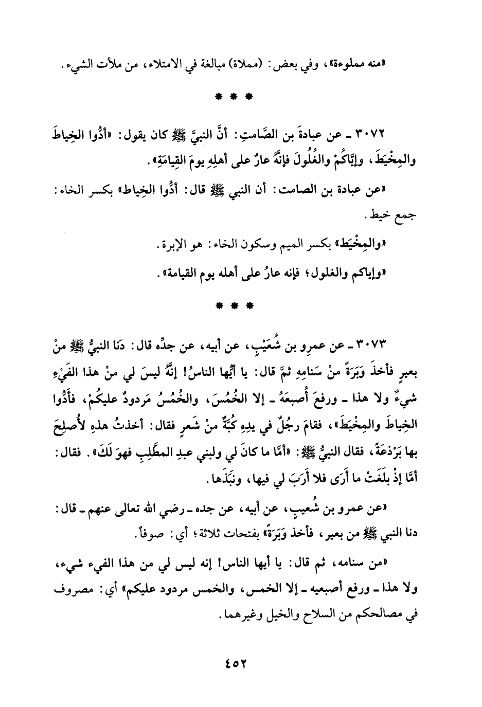 3073 - عن عمرِو بن شُعَيْبٍ، عن أبيه، عن جدِّه قال: دَنا النبيُّ - صلى الله عليه وسلم - منْ بعيرٍ فأخذَ وَبَرَةً منْ سَنامِهِ ثمَّ قال: يا أيُّها الناسُ! إنَّهُ ليسَ لي منْ هذا الفَيْءَ شيءٌ ولا هذا - ورفعَ أُصبعَهُ - إلا الخُمُسَ، والخُمُسُ مَردودٌ عليكُمْ، فأَدُّوا الخِياطَ والمِخْيَطَ"، فقامَ رجُلٌ في يدِهِ كُبَّةٌ منْ شَعرٍ فقال: أخذتُ هذهِ لأصلِحَ بها بَزذعَةً، فقال النبي - صلى الله عليه وسلم -: "أمَّا ما كانَ لي ولبني عبدِ المطَّلِبِ فهوَ لَكَ". فقال: أمَّا إذْ بلَغَتْ ما أَرَى فلا أَرَبَ لي فيها، ونَبَذَها.