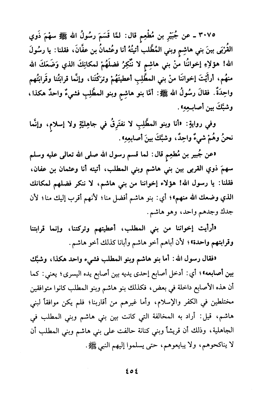 3075 - عن جُبَيْرِ بن مُطْعِم قال: لمَّا قَسَمَ رسُولُ الله - صلى الله عليه وسلم - سهْمَ ذَوي القُرْبَى بينَ بني هاشِمٍ وبني المُطَّلب أتيتُهُ أنا وعُثمانُ بن عفَّانَ، فقلنا: يا رسُولَ الله! هؤلاِءِ إخواننُا منْ بني هاشِم لا نُنْكِرُ فضلَهُمْ لمكانِكَ الذي وَضَعَكَ الله منهُم، أرأَيْتَ إخواننَا منْ بني المطَّلِبِ أعطيتَهُمْ وترَكْتَنا، وإنَّما قرابَتُنا وقَرابتُهم واحِدَةٌ فقالَ رسُولُ الله - صلى الله عليه وسلم -: أمَّا بنو هاشِمٍ وبنو المطَّلِبِ فشيءٌ واحدٌ هكذا، وشبَّكَ بين أصابعِهِ".