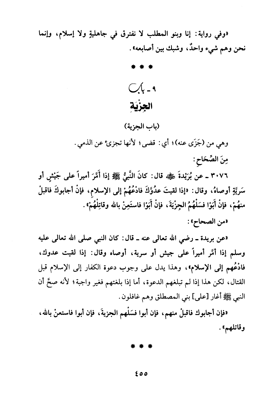 3076 - عن بُرَيْدةَ - رضي الله عنه - قال؛ كانَ النَّبيُّ - صلى الله عليه وسلم - إذا أَمَّرَ أميرًا على جَيشٍ أو سَريَّةٍ أوصاهُ، وقال: "إذا لقيتَ عدُوَّكَ فادْعُهُمْ إلى الإسلامِ، فإن أجابوكَ فاقبلْ منهُمْ، فإنْ أَبَوْا فسَلْهُمُ الجزْيَةَ، فإنْ أَبَوْا فاستَعِنْ بالله وقاتِلْهُمْ ".