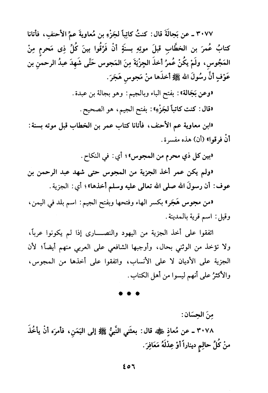 3077 - عن بَجالَةَ قال: كنتُ كاتِبًا لجَزْءِ بن مُعاويةَ عمَّ الأحنفِ، فأتانا كتابُ عُمرَ بن الخطَّابِ قبلَ موتهِ بسنَةٍ أنْ فَرِّقُوا بينَ كُلِّ ذِى مَحرمٍ مِنْ المَجُوسِ، ولَمْ يكُنْ عُمرُ أخذَ الجزْيَةَ مِنَ المَجوس حَتَّى شَهِدَ عبدُ الرحمنِ بن عَوْفٍ أنَّ رسُولَ الله - صلى الله عليه وسلم - أخذَها منْ مَجوسِ هَجَرَ.