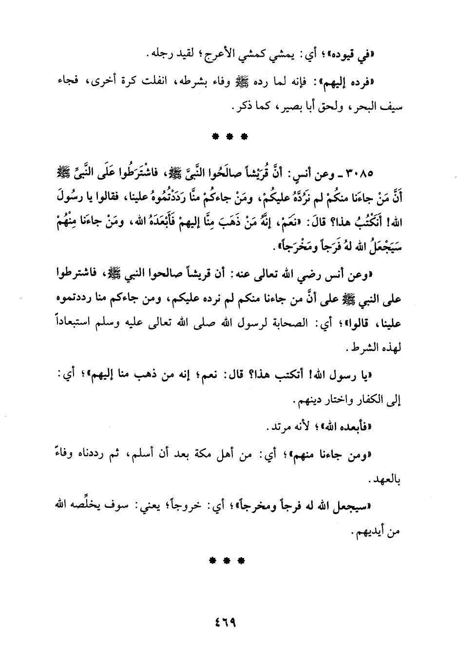 3085 - وعن أنسٍ: أنَّ قُرَيْشًا صالَحُوا النَّبيَّ - صلى الله عليه وسلم -، فاشْتَرَطُوا عَلَى النَّبىِّ - صلى الله عليه وسلم - أَنَّ مَنْ جاءَنا منكُمْ لم نَرُدَّهُ عليكُمْ، ومَنْ جاءكمْ منَّا رَدَدْتُمُوهُ علينا، فقالوا يا رسُولَ الله! أَنَكْتُبُ هذا؟ قالَ: "نعَمْ، إنَّهُ مَنْ ذَهَبَ مِنَّا إليهمْ فَأَبْعَدَهُ الله، ومَنْ جاءَنا مِنْهُمْ سَيَجْعَلُ الله لهُ فَرَجًا ومَخْرَجًا".