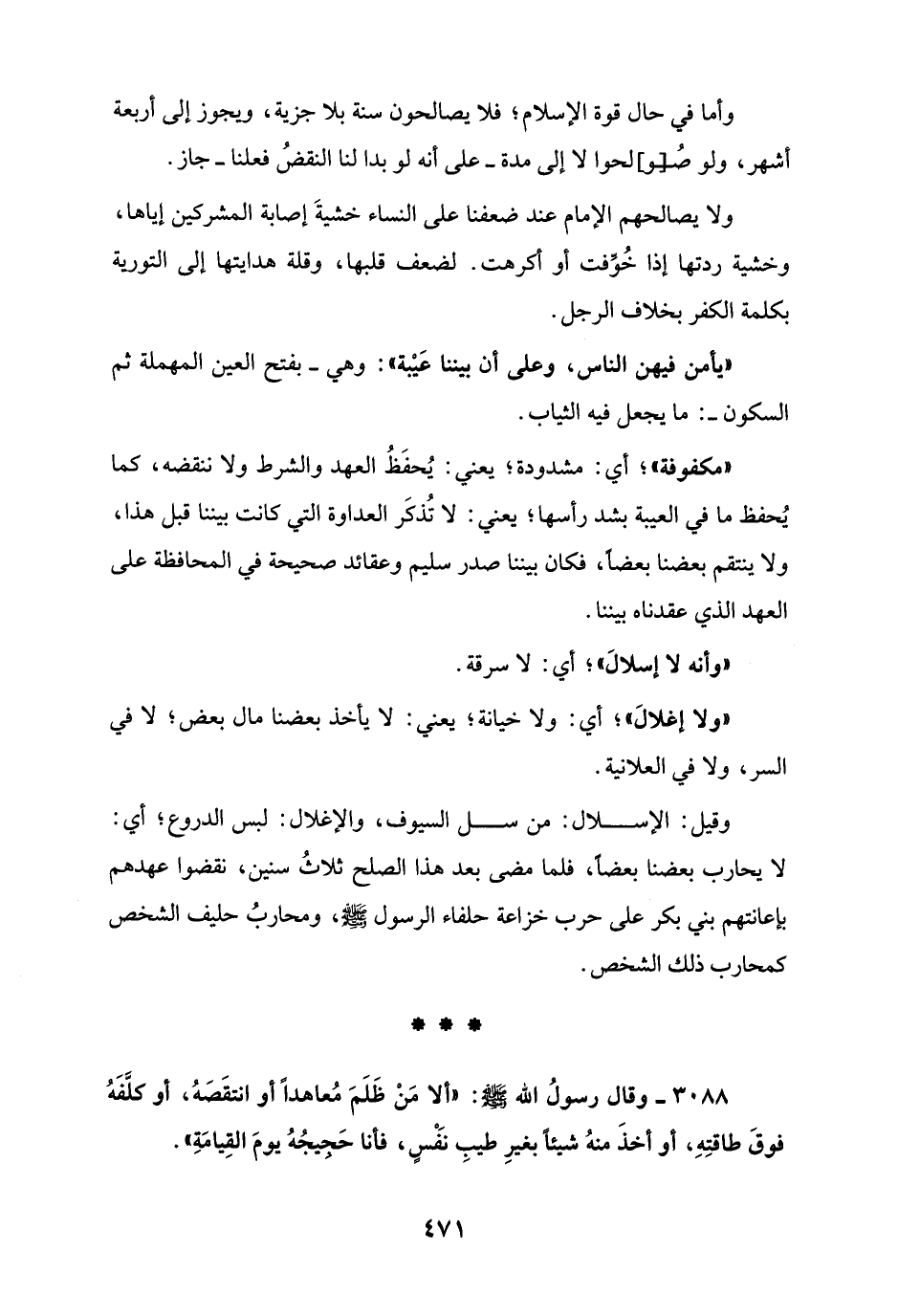 3088 - وقال رسولُ الله - صلى الله عليه وسلم -: "ألا مَنْ ظَلَمَ مُعاهدًا أو انتقَصَهُ، أو كلَّفَهُ فوقَ طاقتِهِ، أو أخذَ منهُ شيئًا بغيرِ طيبِ نَفْسٍ، فأنا حَجيجُهُ يومَ القِيامَةِ".