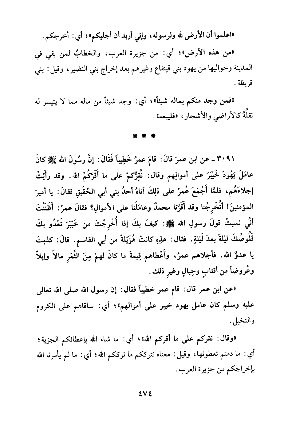 3091 - عن ابن عمرَ قالَ: قامَ عمرُ خَطِيبًا فَقَالَ: إنَّ رسُولَ الله - صلى الله عليه وسلم - كانَ عامَلَ يَهُودَ خَيْبَرَ على أموالِهم وقال: نُقِرُّكمْ على ما أقرَّكُمُ الله. وقد رأَيْتُ إجلاءَهُم، فلمَّا أَجْمَعَ عُمرُ على ذلِكَ أتاهُ أحدُ بني أبي الحُقَيقِ فقالَ: يا أميرَ المؤمنينَ! أتُخْرِجُنا وقد أقرَّنا محمدٌ وعامَلَنا على الأموالِ؟ فقالَ عمرُ: أَظَنَنْتَ أنِّي نسيتُ قولَ رسولِ الله - صلى الله عليه وسلم -: كيفَ بكَ إذا أُخْرِجْتَ من خَيْبَرَ تَعْدُو بكَ قَلُوصُكَ ليْلةً بعدَ لَيْلةٍ. فقال: هذهِ كانتْ هُزَيْلةً من أبي القاسم. قالَ: كذبتَ يا عدوَّ الله. فأجلاهم عمرُ، وأَعْطاهم قِيمةَ ما كانَ لهمْ مِنَ الثمَرِ مالاً وإبلاً وعُروضًا من أقتابٍ وحِبالٍ وغيرِ ذلك.