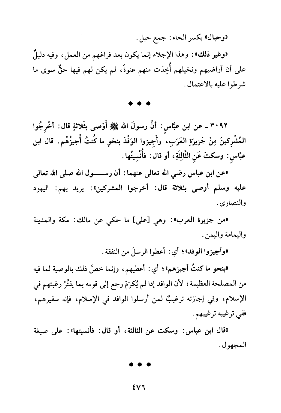 3092 - عن ابن عبَّاسٍ: أنَّ رسولَ الله - صلى الله عليه وسلم - أَوْصى بثَلاثةٍ قال: أخْرِجُوا المُشْرِكينَ مِنْ جَزيرَةِ العَرَبِ، وأَجِيزوا الوَفْدَ بنحْوِ ما كُنتُ أُجيزُهُم. قال ابن عبَّاسٍ: وسكتَ عَنِ الثَّالِثَةِ، أو قال: فأُنْسِيتُها.