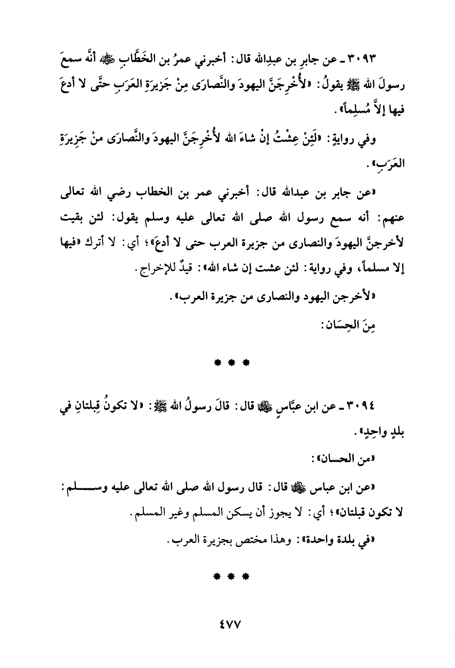 3093 - عن جابرِ بن عبدِ الله قال: أخبرني عمرُ بن الخَطَّابِ - رضي الله عنه - أنَّه سمعَ رسولَ الله - صلى الله عليه وسلم - يقولُ: "لأخْرِجَنَّ اليهودَ والنَّصارَى مِنْ جَزيرَةِ العَرَبِ حتَّى لا أدعَ فيها إلَّا مُسلِمًا".