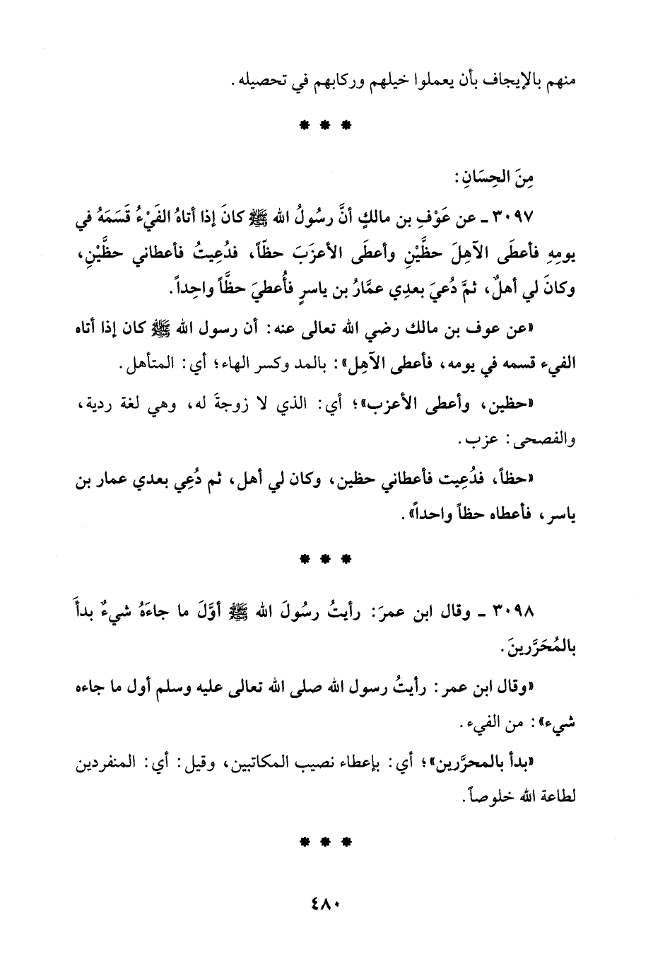 3097 - عن عَوْفِ بن مالكٍ أنَّ رسُولُ الله - صلى الله عليه وسلم - كانَ إذا أتاهُ الفَيْءُ قَسَمَهُ في يومِهِ فأعطَى الآهِلَ حظَّيْنِ وأعطَى الأعزَبَ حظًّا، فدُعِيتُ فأعطاني حظَّيْنِ، وكانَ لي أهلٌ، ثمَّ دُعيَ بعدِي عمَّارُ بن ياسرٍ فأُعطيَ حظًّا واحِدًا.