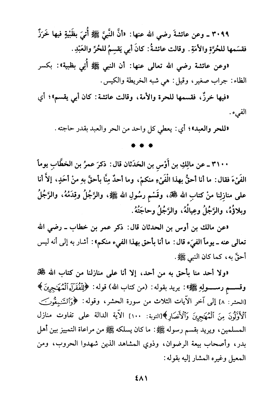 3100 - عن مالِكِ بن أَوْسِ بن الحَدَثان قال: ذكرَ عمرُ بن الخطَّابِ يومًا الفَىْءَ فقال: ما أنا أحقُّ بهذا الْفَئِ منكمْ، وما أحدٌ مِنَّا باحقَّ بهِ منْ أحَدٍ، إلَّا أنا على منازِلنا منْ كتابِ الله عز وجل، وقَسْم رسُولِ الله - صلى الله عليه وسلم -، والرَّجُلُ وقِدَمُهُ، والرَّجُلُ وبلاؤُهُ، والرَّجُلُ وعِيالُهُ، والرَّجُلُ وحاجَتُهُ.