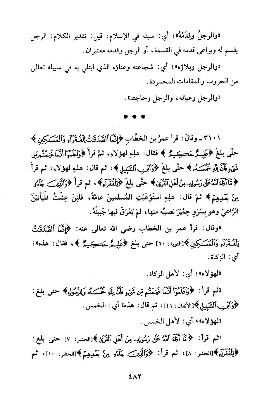 3101 - وقالَ: قرأ عمرُ بن الخطَّابِ {إِنَّمَا الصَّدَقَاتُ لِلْفُقَرَاءِ وَالْمَسَاكِينِ} حتَّى بلغَ {عَلِيمٌ حَكِيمٌ} فقال: هذ لهؤلاءَ، ثمَّ قرأَ {وَاعْلَمُوا أَنَّمَا غَنِمْتُمْ مِنْ شَيْءٍ فَأَنَّ لِلَّهِ خُمُسَهُ} حتَّى بلغَ {وَابْنِ السَّبِيلِ}، ثم قال: هذهِ لهؤلاءِ، ثم قرأَ {مَا أَفَاءَ اللَّهُ عَلَى رَسُولِهِ مِنْ أَهْلِ الْقُرَى} حتَّى بلغَ {لِلْفُقَرَاءِ}، ثم قرأَ {وَالَّذِينَ جَاءُوا مِنْ بَعْدِهِمْ} ثمّ قال: هذِهِ استَوْعَبَتِ المُسلمينَ عامَّةً، فلئِنْ عِشْتُ فلَيأْتيَنَّ الرَّاعي وهو بِسَرْوِ حِمْيَرَ نصيبُه منها، لمْ يَعْرَقْ فيها جَبينُهُ.