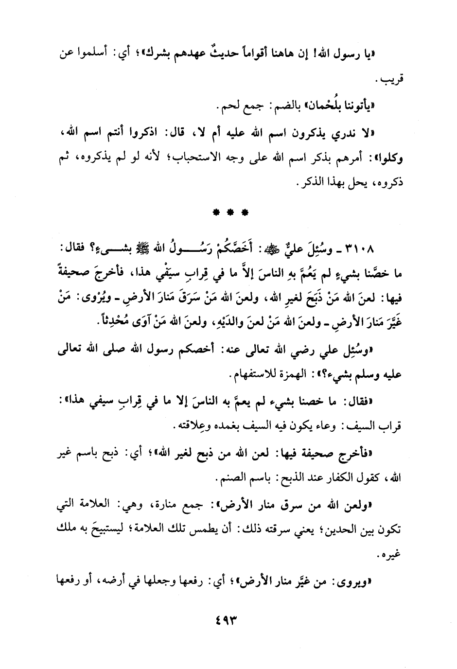 3108 - وسُئِلَ عليٌّ - صلى الله عليه وسلم -: أَخَصَّكُم رَسُولُ الله - صلى الله عليه وسلم - بشيءٍ؟ فقال: ما خصَّنا بشيءٍ لم يَعُمَّ بهِ الناسَ إلَّا ما في قِرابِ سيَفْي هذا، فأخرجَ صحيفةً فيها: لعنَ الله مَنْ ذَبَحَ لغيرِ الله، ولعنَ الله مَنْ سَرَقَ مَنارَ الأرضِ - ويُرْوى: مَنْ غَيَّرَ مَنارَ الأرضِ - ولعنَ الله مَنْ لعنَ والدَيْهِ، ولعنَ الله مَنْ آوَى مُحْدِثًا.