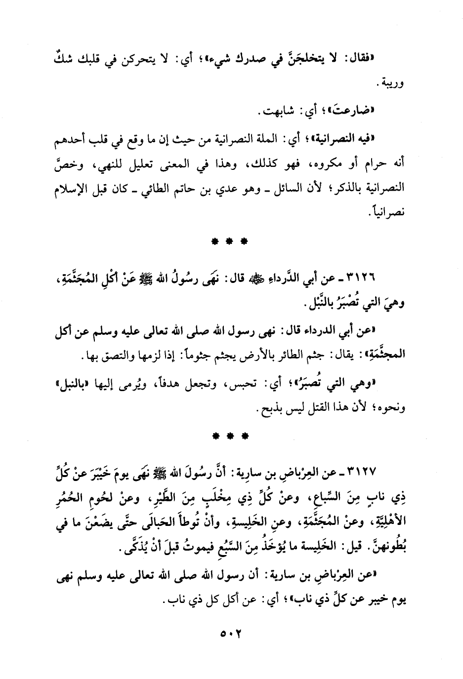 3127 - عن العِرباضِ بن سارِية: أنَّ رسُولَ الله - صلى الله عليه وسلم - نهَى يومَ خَيْبَرَ عنْ كُلِّ ذِي نابٍ مِنَ السِّباعِ، وعنْ كُلِّ ذِي مِخْلَبٍ مِنَ الطَّيْرِ، وعنْ لحُومِ الحُمُرِ الأهْلِيَّةِ، وعنْ المُجَثَّمَةِ، وعنِ الخَلِيسةِ، وأنْ تُوطأ الحَبالَى حتَّى يضَعْنَ ما في بُطُونهنَّ. قيل: الخَلِيسة ما يُؤخَذُ مِنَ السَّبُعِ فيموتُ قبلَ أنْ يُذَكَّى.