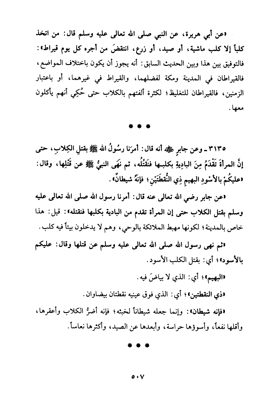 3135 - وعن جابرٍ - رضي الله عنه - أنه قال: أمرَنا رسُولُ الله - صلى الله عليه وسلم - بقتلِ الكِلابِ، حتى أنَّ المرأةَ تَقْدَمُ مِنَ البادِيةِ بكلبها فنَقتُلُه، ثم نهى النبيُّ - صلى الله عليه وسلم - عن قَتْلِها، وقال: "عليكُمْ بالأسْودِ البهيم ذِي النُّقطَتَيْنِ؛ فإنهُ شيطانٌ".
