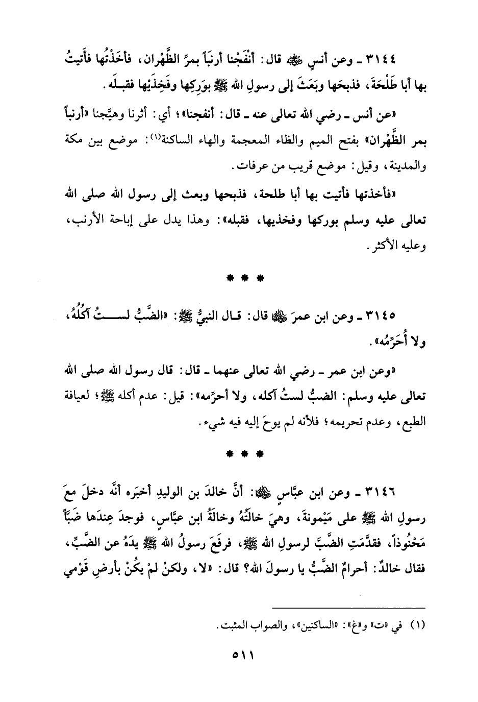 3145 - وعن ابن عمرَ - رضي الله عنه - قال: قال النبيُّ - صلى الله عليه وسلم -: "الضَّبُّ لستُ آكُلُهُ، ولا أُحَرِّمُه".