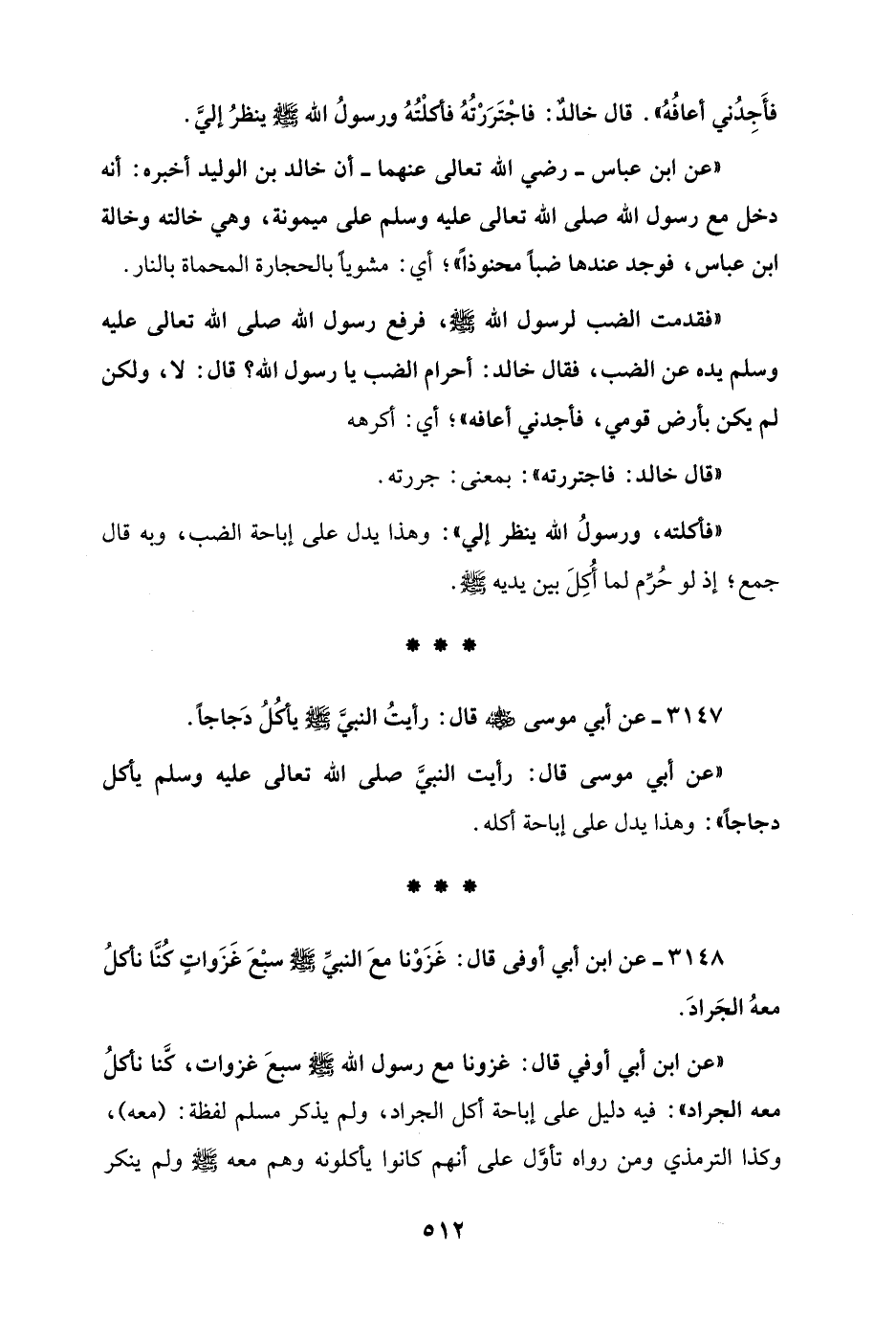 3148 - عن ابن أبي أوفى قال: غَزَوْنا معَ النبيِّ - صلى الله عليه وسلم - سبْعَ غَزَواتٍ كُنَّا نأكلُ معهُ الجَرادَ.