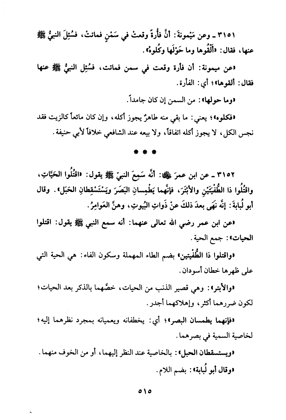 3152 - عن ابن عمرَ - رضي الله عنه -: أنَّه سَمعَ النبي - صلى الله عليه وسلم - يقول: "اقتُلُوا الحَيَّاتِ، واقتُلُوا ذا الطُّفْيَتَيْنِ والأبْتَرَ، فإنَّهما يَطْمِسانِ البَصَرَ ويَسْتَسْقِطانِ الحَبَل". وقال أبو لُبابةَ: إنَّه نَهَى بعدَ ذلكَ عنْ ذَواتِ البُيوتِ، وهنَّ العَوامِرُ.