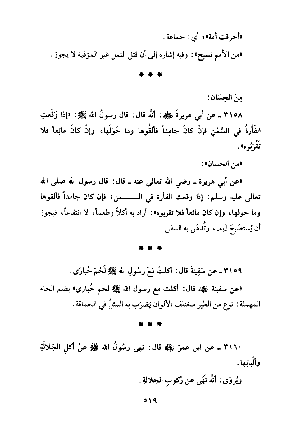 " عن أبي هريرة - رضي الله تعالى عنه - قال: قال رسول الله صلى الله تعالى عليه وسلم: إذا وقعت الفأرة في السمن؛ فإن كان جامدًا فألقوها وما حولها، وإن كان مائعًا فلا تقربوه": أراد به أكلًا وطعمًا، لا انتفاعًا، فيجوز أن يُستصَبحَ [به]، وتُدهَن به السفن.