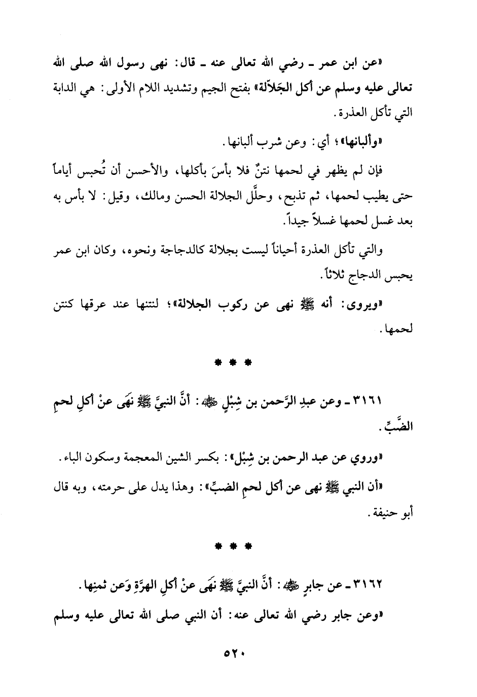 "عن ابن عمر - رضي الله تعالى عنه - قال: نهى رسول الله صلى الله تعالى عليه وسلم عن أكل الجَلّالة" بفتح الجيم وتشديد اللام الأولى: هي الدابة التي تأكل العذرة.