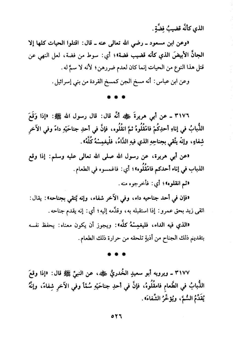 3176 - عن أبي هريرةَ - رضي الله عنه - أنَّه قال: قال رسول الله - صلى الله عليه وسلم -: "إذا وَقَعَ الذُّبابُ في إناءِ أحدِكمْ فامْقُلُوهُ ثمَّ انقُلُوه، فإنَّ في أحدِ جناحَيْهِ داءً وفي الآخرِ شِفاءٍ، وإنه يتَّقي بجناحِهِ الذي فيهِ الدَّاءُ، فلْيغمِسْهُ كُلَّهُ".