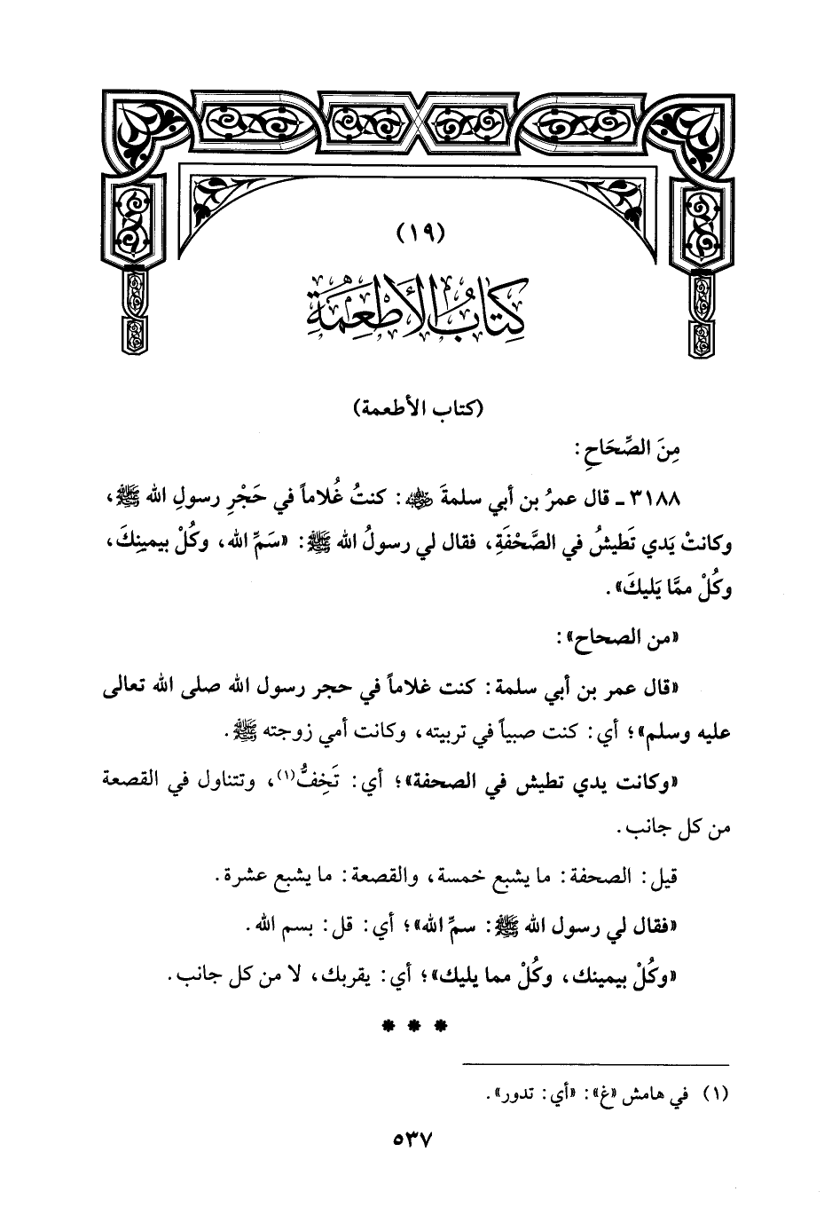 3188 - قال عمرُ بن أبي سلمةَ - رضي الله عنه -: كنتُ غُلامًا في حَجْرِ رسولِ الله - صلى الله عليه وسلم -، وكانتْ يَدي تَطيشُ في الصَّحْفَةِ، فقال لي رسولُ الله - صلى الله عليه وسلم -: "سَمِّ الله، وكُلْ بيمينِكَ، وكُلْ ممَّا يَليكَ".