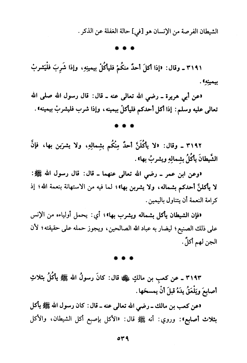 "عن كعب بن مالك - رضي الله تعالى عنه - قال: كان رسول الله - صلى الله عليه وسلم - يأكل بثلاث أصابع": وروي: أنه - صلى الله عليه وسلم - قال: "الأكل بإصبع أكل الشيطان، والأكل