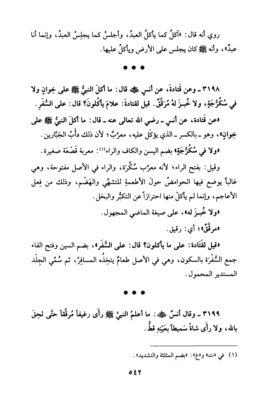 3198 - وعن قَتادةَ، عن أنسٍ - رضي الله عنه - قال: ما أكلَ النبيُّ - صلى الله عليه وسلم - على خِوانٍ ولا في سُكُرُّجَةٍ، ولا خُبزَ لهُ مُرَقَّقٌ. قيل لقتادةَ: علامَ يأكُلونَ؟ قال: على السُّفَرِ.