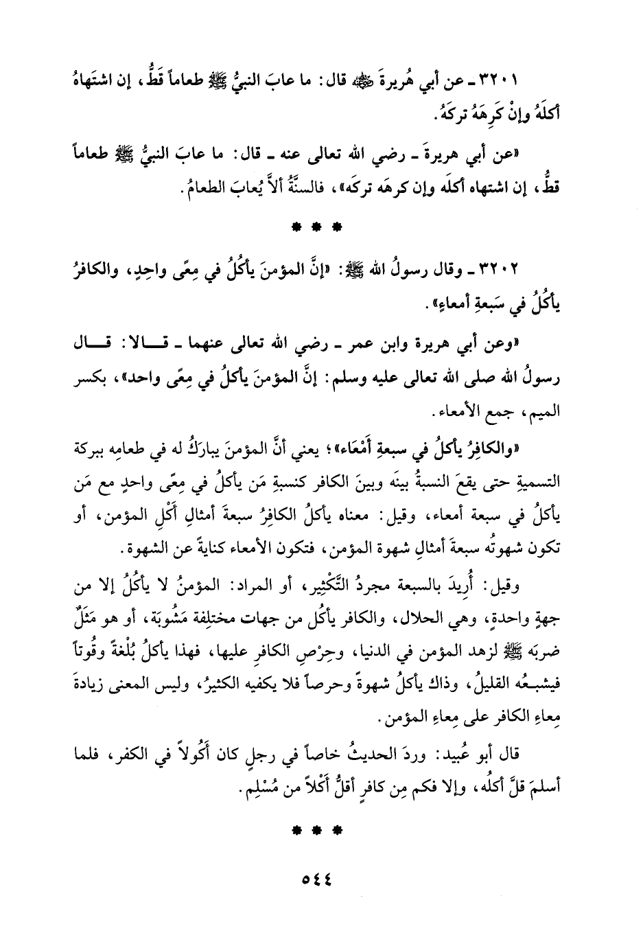 3202 - وقال رسولُ الله - صلى الله عليه وسلم -: "إنَّ المؤمنَ يأكُلُ في مِعًى واحِدٍ، والكافرُ يأكُلُ في سَبعةِ أمعاءً".