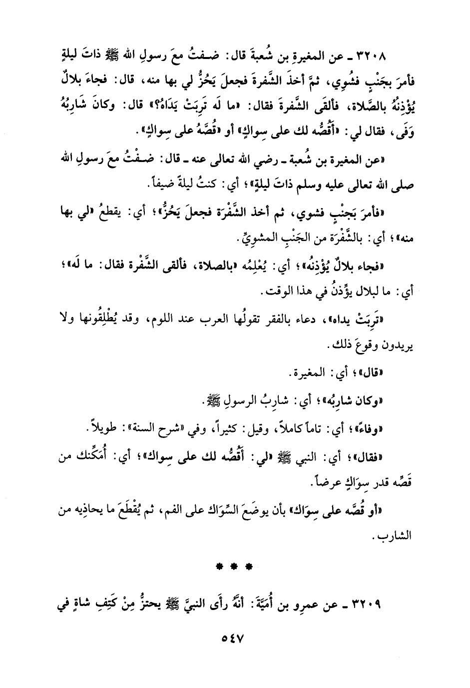3208 - عن المغيرةِ بن شُعبةَ قال: ضفتُ معَ رسولِ الله - صلى الله عليه وسلم - ذاتَ ليلةٍ فأمرَ بجَنْبٍ فشُوِي، ثمَّ أخذَ الشَّفرةَ فجعلَ يَحُزُّ لي بها منه، قال: فجاءَ بلالٌ يُؤْدِنُهُ بالصَّلاة، فألقَى الشَّفرةَ فقال: "ما لَه تَرِبَتْ يَدَاهُ؟ " قال: وكانَ شَارِبُهُ وَفَى، فقال لي: "أَقُصُّه لك على سِواكٍ" أو "قُصَّهُ على سِواكٍ".