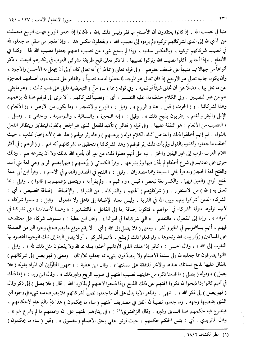 منها في نصيب الله ، إذ كانوا يعتقدون أن الأصنام بها فقر وليس ذلك بالله فكانوا إذا جمعوا الزرع فهبت الريح فحملت من الذي لله إلى الذي لشركائهم تركوه ولم يردوه إلى نصيب الله ويفعلون عكس هذا ، وإذا تفجر من سقي ما جعلوه لله في نصيب شركائهم تركوه وبالعكس سدوه وإذا لم ينجح شيء من نصيب آلهتهم جعلوا نصيب الله لها ، وكذا في الأنعام . وإذا أجدبوا أكلوا نصيب الله وتركوا نصيبها لما ذكر تعالى قبح طريقة مشركي العرب في إنكارهم البعث ذكر أنواعاً من جهالاتهم تنبيهاً على ضعف عقولهم وفي قوله تعالى : ) مِمَّا ذَرَأَ ( أنه تعالى كان أولى أن يجعل له الأحسن والأجود وأن يكون جانبه تعالى هو الأرجح ، إذ كان تعالى هو الموجد لما جعلوا له منه نصيباً والقادر على تنميته دون أصنامهم العاجزة عن ما يحل بها فضلاً عن أن تخلق شيئاً أو تنميه وفي قوله ) مّمَّا ( بمن التبعيضية دليل على قسم ثالث وهو ما بقي لهم من غير النصيبين ، وفي الكلام حذف دل عليه التقسيم أي ونصيباً ) لِشُرَكَائِهِمْ ( ألا ترى إلى قولهم ) هَاذَا لِلَّهِ بِزَعْمِهِمْ وَهَاذَا لِشُرَكَائِنَا ( و ) الْحَرْثِ ( قيل هنا : الزرع . وقيل : الزرع والأشجار وما يكون من الأرض ، ( وَالاْنْعَامُ ( الإبل والبقر والغنم يتقربون بذبح ذلك . وقيل : إنه البحيرة والسائبة والوصيلة والحامي . وقيل : النصيب من الأنعام هو النفقة عليها وفي قوله : ) فَقَالُواْ ( تأكيد للفعل الذي هو الجعل بالقول ليتطابق ويتظافر الفعل بالقول ، ثم إنهم أخلفوا ذلك واعترض أثناء الكلام قوله : ) يزعمهم ( وجاء أثر قولهم : ) فَقَالُواْ هَاذَا لِلَّهِ ( لأنه إخبار كذب حيث أخلف ما جعلوه وأكدوه بالقول ولم يأت ذلك إثر قولهم : ) وَهَاذَا لِشُرَكَائِنَا ( لتحقيق ما لشركائهم أنه لهم والزعم في أكثر كلام العرب أقرب إلى غير اليقين والحق نبه على أنهم فعلوا ذلك من غير أن يأمرهم الله بذلك ولا أن يشرعه لهم ، وذلك جرى على عادتهم في شرع أحكام لم يأذن فيها ولم يشرعها . وقرأ الكسائي : ) بِزَعْمِهِمْ ( فيهما بضم الزاي وهي لغة بني أسد والفتح لغة الحجاز وبه قرأ باقي السبعة وهما مصدران . وقيل : الفتح في المصدر والضم في الاسم . وقرأ ابن أبي عبلة : بفتح الزاي والعين فيهما والسكر لغة لبعض قيس وتميم ، ولم يقرأ به ويتعلق ) بِزَعْمِهِمْ ( بقالوا . وقيل : بما تعلق به ) لِلَّهِ ( من الاستقرار وشركاؤهم آلهتهم والشركاء من الشرك والإضافة إضافة تخصيص أي : الشركاء الذين أشركوا بينهم وبين الله في القربة وليس معناه الإضافة إلى فاعل ولا مفعول . وقيل : سموا شركاء لأنهم نزلوها منزلة الشركاء في أموالهم فتكون إضافة إما إلى الفاعل فالتقدير وهذا لأصنامنا التي تشركنا في أموالنا ، وإما إلى المفعول فالتقدير التي شركناها في أموالنا . وقال ابن عطية : سموهم شركاء على معتقدهم فيهم أنهم يساهمونهم في الخير والشر ، ومعنى ) فَلاَ يَصِلُ إِلَى اللَّهِ ( أي لا يقع موقع ما يصرف في وجوه البر من الصدقة على المساكين وزوّار بيت الله ونحوها ، ولو فعلوا ذلك لم ينفع لأنهم أشركوا أو لا يصل ألبتة إلى تلك الوجوه المقصود بها التقرب إلى الله . وقال الحسن : كانوا إذا هلك الذي لأوثانهم أخذوا بدله مما لله ولا يفعلون مثل ذلك لله . وقيل : كانوا يصرفون مما جعلوه لله إلى سدنة الأصنام ولا يتصدّقون بشيء مما جعلوه للأوثان ، ومعنى ) فَهُوَ يَصِلُ إِلَى شُرَكَائِهِمْ ( بإنفاق عليها بذبح نسائك عندها والآخر للنفقة على سدنتها . وقال ابن عطية : جمهور المتأوّلين إن المراد بقوله : ) فَلاَ يَصِلُ ( وقوله : ) يَصِلُ ( ما قدمنا ذكره من حمايتهم نصيب آلهتهم في هبوب الريح وغير ذلك . وقال ابن زيد : إنما ذلك في أنهم كانوا إذا ذبحوا لله وذكروا آلهتهم على ذلك الذبح ، وإذا ذبحوا لآلهتهم لم يذكروا الله قال : ) فَلاَ يَضِلُّ ( إلى ذكر وقال : ) فَهُوَ يَصِلُ ( إلى ذكر الله ؛ انتهى . وظاهر الآية يدل على أن ما جعلوه نصيباً لشركائهم فلا يصرف منه شيء في وجوه البر الذي يقتضيها وجهه ، وما جعلوه نصيباً لله أنفق في مصاريف آلهتهم ) سَاء مَا يَحْكُم