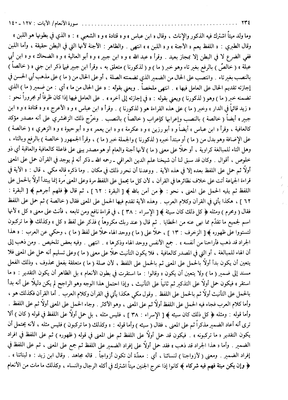 وما ولد ميتاً اشترك فيه الذكور والإناث . وقال ابن عباس وقتادة والشعبي : الذي في بطونها هو اللبن . وقال الطبري : اللفظ يعم الأجنة واللبن ؛ انتهى . والظاهر الأجنة لأنها التي في البطن حقيقة ، وأما اللبن : ففي الضرع لا في البطن إلا بمجاز بعيد . وقرأ عبد الله وابن جبير وأبو العالية والضحاك وابن أبي عبلة : خالص بالرفع بغير تاء وهو خبر ما و ) لِّذُكُورِنَا ( متعلق به . وقرأ ابن جبير فيما ذكر ابن جني خالصاً بالنصب بغير تاء ، وانتصب على الحال من الضمير الذي تضمنته الصلة أو على الحال من ما على مذهب أبي الحسن في إجازته تقديم الحال على العامل فيها ؛ انتهى ملخصاً . ويعني بقوله : على الحال من ) مَا ( أي من ضمير ) مَا ( الذي تضمنه خبر ) مَا ( وهو ) لِّذُكُورِنَا ( ويعني بقوله : في إجازته إلى آخره على العامل فيها إذا كان ظرفاً أو مجروراً نحو زيد قائماً في الدار ، وخبر ) مَا ( على هذه القراءة هو ) لِّذُكُورِنَا ). وقرأ ابن عباس والأعرج وقتادة وابن جبير أيضاً ) خَالِصَةٌ ( بالنصب وإعرابها كإعراب خالصاً بالنصب وخرّج ذلك الزمخشري على أنه مصدر مؤكد كالعافية . وقرأ ابن عباس أيضاً وأبو رزين وعكرمة وابن يعمر وأبو حيوة والزهري ) خَالِصَةٌ ( على الإضافة وهو بدل من ) مَا ( أو مبتدأ خبره ) لِّذُكُورِنَا ( والجملة خبر ما . وقرأ الجمهور ) خَالِصَةٌ ( بالرفع وبالتاء وهل التاء للمبالغة كراوية أو حملاً على معنى ما لأنها أجنة والعام أو هو مصدر يبنى على فاعلة كالعافية والعافية أي ذو خلوص ؟ أقوال : وكان قد سبق لنا إن شيخنا علم الدين العراقي رحمه الله ذكر أنه لم يوجد في القرآن حمل على المعنى أولاً ثم حمل على اللفظ بعده إلا في هذه الآية ، ووعدنا أن نحرر ذلك في مكان وما ذكره قاله مكي ، قال : الآية في قراءة الجماعة أتت على خلاف نظائرها في القرآن لأن كل ما يحمل على اللفظ مرة وعلى المعنى مرة إنما يبتدأ أولاً بالحمل على اللفظ ، ثم يليه الحمل على معنى نحو ) مَنْ ءامَنَ بِاللَّهِ ( ثم قال : ) فَلَهُمْ أَجْرُهُمْ ( هكذا يأتي في القرآن وكلام العرب . وهذه الآية تقدم فيها الحمل على المعنى فقال : ) خَالِصَةٌ ( ثم حمل على اللفظ فقال : و ) مُحَرَّمٌ ( ومثله كل ذلك كان سيئة في قراءة نافع ومن تابعه فأنث على معنى كل لأنها اسم لجميع ما تقدّم مما نهي عنه من الخطايا ، ثم قال : ) عِنْدَ رَبّكَ مَكْرُوهًا ( فذكر على لفظ كل ، وكذلك ) مَا تَرْكَبُونَ لِتَسْتَوُواْ عَلَى ظُهُورِهِ ( حملاً على ما ، ووحد الهاء حملاً على لفظ ما . وحكي عن العرب هذا الجراد قد ذهب فأراحنا من أنفسه جمع الأنفس ووحد الهاء وذكرها انتهى وفيه بعض تلخيص . ومن ذهب إلى أن الهاء للمبالغة أو التي في المصدر كالعافية فلا يكون التأنيث حملاً على معنى ما ، وعلى تسليم أنه حمل على المعنى فلا يتعين أن يكون بدأ أولاً بالحمل على المعنى ثم بالجمل على اللفظ لأن صلة ما متعلقة بفعل محذوف وذلك الفعل مسند إلى ضمير ما ولا يتعين أن يكون وقالوا : ما استقرت في بطون الإنعام ، بل الظاهر أن يكون التقدير ما استقر فيكون حمل أولاً على التذكير ثم ثانياً على التأنيث ، وإذا احتمل هذا الوجه وهو الراجح لم يكن دليلاً على أنه بدأ بالحمل على التأنيث أولاً ثم بالحمل على اللفظ وقول مكي هكذا يأتي في القرآن وكلام العرب ، أما القرآن فكذلك هو ، وأما كلام العرب فجاء فيه الحمل على اللفظ أولاً ثم على المعنى وهو الأكثر وجاء الحمل على المعنى أولاً ثم على اللفظ ، وأما قوله : ومثله كل ذلك كان سيئة فليس مثله ، بل حمل أولاً على اللفظ في قوله : كان ألا ترى أنه أعاد الضمير مذكراً ثم على المعنى فقال : سيئة وأما قوله : وكذلك ما تركبون فليس مثله ، لأنه يحتمل أن يكون التقدير ما تركبونه فيكون قد حمل أولاً على اللفظ ثم على المعنى في قوله : ظهوره ثم على اللفظ في إفراد الضمير ، وأما هذا الجراد قد ذهب فقد حمل أولاً على إفراد الضمير على اللفظ ثم جمع على المعنى ثم على اللفظ في إفراد الضمير ، ومعنى لأزواجنا : لنسائنا أي معدّة أن تكون أزواجاً قاله مجاهد . وقال ابن زيد : لبناتنا .