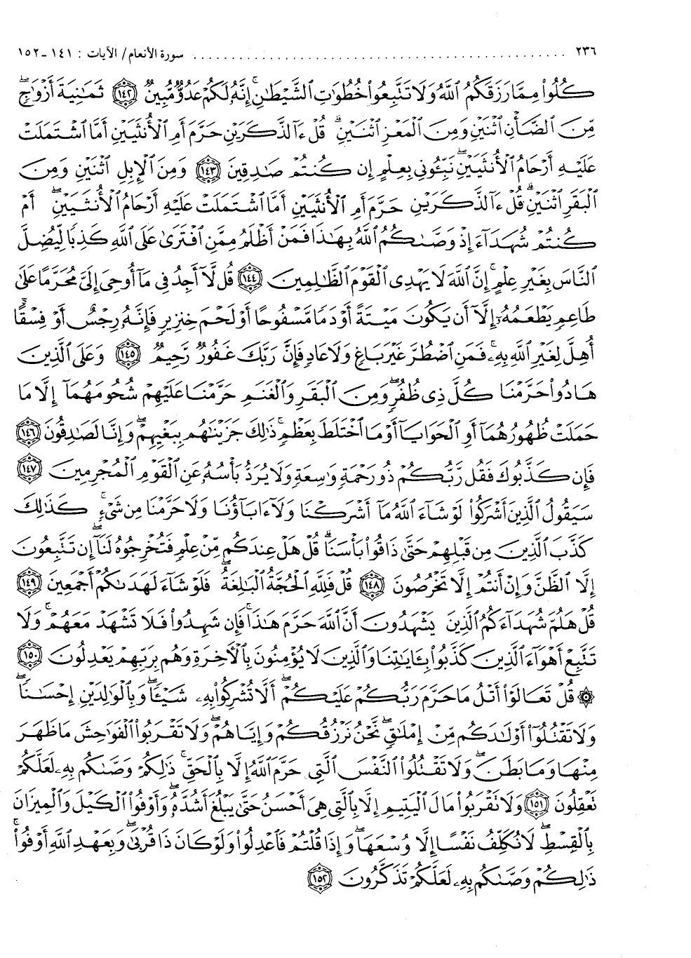 كُلُواْ مِمَّا رَزَقَكُمُ اللَّهُ وَلاَ تَتَّبِعُواْ خُطُوَاتِ الشَّيْطَانِ إِنَّهُ لَكُمْ عَدُوٌّ مُّبِينٌ ثَمَانِيَةَ أَزْوَاجٍ مِّنَ الضَّأْنِ اثْنَيْنِ وَمِنَ الْمَعْزِ اثْنَيْنِ قُلْ ءَآلذَّكَرَيْنِ حَرَّمَ أَمِ الأُنثَيَيْنِ أَمَّا اشْتَمَلَتْ عَلَيْهِ أَرْحَامُ الأُنثَيَيْنِ نَبِّئُونِي بِعِلْمٍ إِن كُنتُمْ صَادِقِينَ وَمِنَ الإِبِلِ اثْنَيْنِ وَمِنَ الْبَقَرِ اثْنَيْنِ قُلْ ءَآلذَّكَرَيْنِ حَرَّمَ أَمِ الأُنْثَيَيْنِ أَمَّا اشْتَمَلَتْ عَلَيْهِ أَرْحَامُ الأُنْثَيَيْنِ أَمْ كُنتُمْ شُهَدَآءَ إِذْ وَصَّاكُمُ اللَّهُ بِهَاذَا فَمَنْ أَظْلَمُ مِمَّنِ افْتَرَى عَلَى اللَّهِ كَذِبًا لِيُضِلَّ النَّاسَ بِغَيْرِ عِلْمٍ إِنَّ اللَّهَ لاَ يَهْدِي الْقَوْمَ الظَّالِمِينَ قُل لاَ أَجِدُ فِى مَآ أُوْحِىَ إِلَىَّ مُحَرَّمًا عَلَى طَاعِمٍ يَطْعَمُهُ إِلاَ أَن يَكُونَ مَيْتَةً أَوْ دَمًا مَّسْفُوحًا أَوْ لَحْمَ خِنزِيرٍ فَإِنَّهُ رِجْسٌ أَوْ فِسْقًا أُهِلَّ لِغَيْرِ اللَّهِ بِهِ فَمَنِ اضْطُرَّ غَيْرَ بَاغٍ وَلاَ عَادٍ فَإِنَّ رَبَّكَ غَفُورٌ رَّحِيمٌ وَعَلَى الَّذِينَ هَادُواْ حَرَّمْنَا كُلَّ ذِى ظُفُرٍ وَمِنَ الْبَقَرِ وَالْغَنَمِ حَرَّمْنَا عَلَيْهِمْ شُحُومَهُمَآ إِلاَّ مَا حَمَلَتْ ظُهُورُهُمَآ أَوِ الْحَوَايَآ أَوْ مَا اخْتَلَطَ بِعَظْمٍ ذالِكَ جَزَيْنَاهُم بِبَغْيِهِمْ وِإِنَّا لَصَادِقُونَ فَإِن كَذَّبُوكَ فَقُل رَّبُّكُمْ ذُو رَحْمَةٍ وَاسِعَةٍ وَلاَ يُرَدُّ بَأْسُهُ عَنِ الْقَوْمِ الْمُجْرِمِينَ سَيَقُولُ الَّذِينَ أَشْرَكُواْ لَوْ شَآءَ اللَّهُ مَآ أَشْرَكْنَا وَلاَ ىَابَآؤُنَا وَلاَ حَرَّمْنَا مِن شَىْءٍ كَذالِكَ كَذَّبَ الَّذِينَ مِن قَبْلِهِمْ حَتَّى ذَاقُواْ بَأْسَنَا قُلْ هَلْ عِندَكُم مِّنْ عِلْمٍ فَتُخْرِجُوهُ لَنَآ إِن تَتَّبِعُونَ إِلاَّ الظَّنَّ وَإِنْ أَنتُمْ إِلاَّ تَخْرُصُونَ قُلْ فَلِلَّهِ الْحُجَّةُ الْبَالِغَةُ فَلَوْ شَآءَ لَهَدَاكُمْ أَجْمَعِينَ قُلْ هَلُمَّ شُهَدَآءَكُمُ الَّذِينَ يَشْهَدُونَ أَنَّ اللَّهَ حَرَّمَ هَاذَا فَإِن شَهِدُواْ فَلاَ تَشْهَدْ مَعَهُمْ وَلاَ تَتَّبِعْ أَهْوَآءَ الَّذِينَ كَذَّبُواْ بِآيَاتِنَا وَالَّذِينَ لاَ يُؤْمِنُونَ بِالاٌّ خِرَةِ وَهُم بِرَبِّهِمْ يَعْدِلُونَ قُلْ تَعَالَوْاْ أَتْلُ مَا حَرَّمَ رَبُّكُمْ عَلَيْكُمْ أَلاَّ تُشْرِكُواْ بِهِ شَيْئاً وَبِالْوَالِدَيْنِ إِحْسَاناً وَلاَ تَقْتُلُواْ أَوْلَادَكُمْ مِّنْ إمْلَاقٍ نَّحْنُ نَرْزُقُكُمْ وَإِيَّاهُمْ وَلاَ تَقْرَبُواْ الْفَوَاحِشَ مَا ظَهَرَ مِنْهَا وَمَا بَطَنَ وَلاَ تَقْتُلُواْ النَّفْسَ الَّتِى حَرَّمَ اللَّهُ إِلاَّ بِالْحَقِّ ذالِكُمْ وَصَّاكُمْ بِهِ لَعَلَّكُمْ تَعْقِلُونَ وَلاَ تَقْرَبُواْ مَالَ الْيَتِيمِ إِلاَّ بِالَّتِى هِىَ أَحْسَنُ حَتَّى يَبْلُغَ أَشُدَّهُ وَأَوْفُواْ الْكَيْلَ وَالْمِيزَانَ بِالْقِسْطِ لاَ نُكَلِّفُ نَفْسًا إِلاَّ وُسْعَهَا وَإِذَا قُلْتُمْ فَاعْدِلُواْ وَلَوْ كَانَ ذَا قُرْبَى وَبِعَهْدِ اللَّهِ أَوْفُواْ ذالِكُمْ وَصَّاكُمْ بِهِ لَعَلَّكُمْ تَذَكَّرُونَ } )