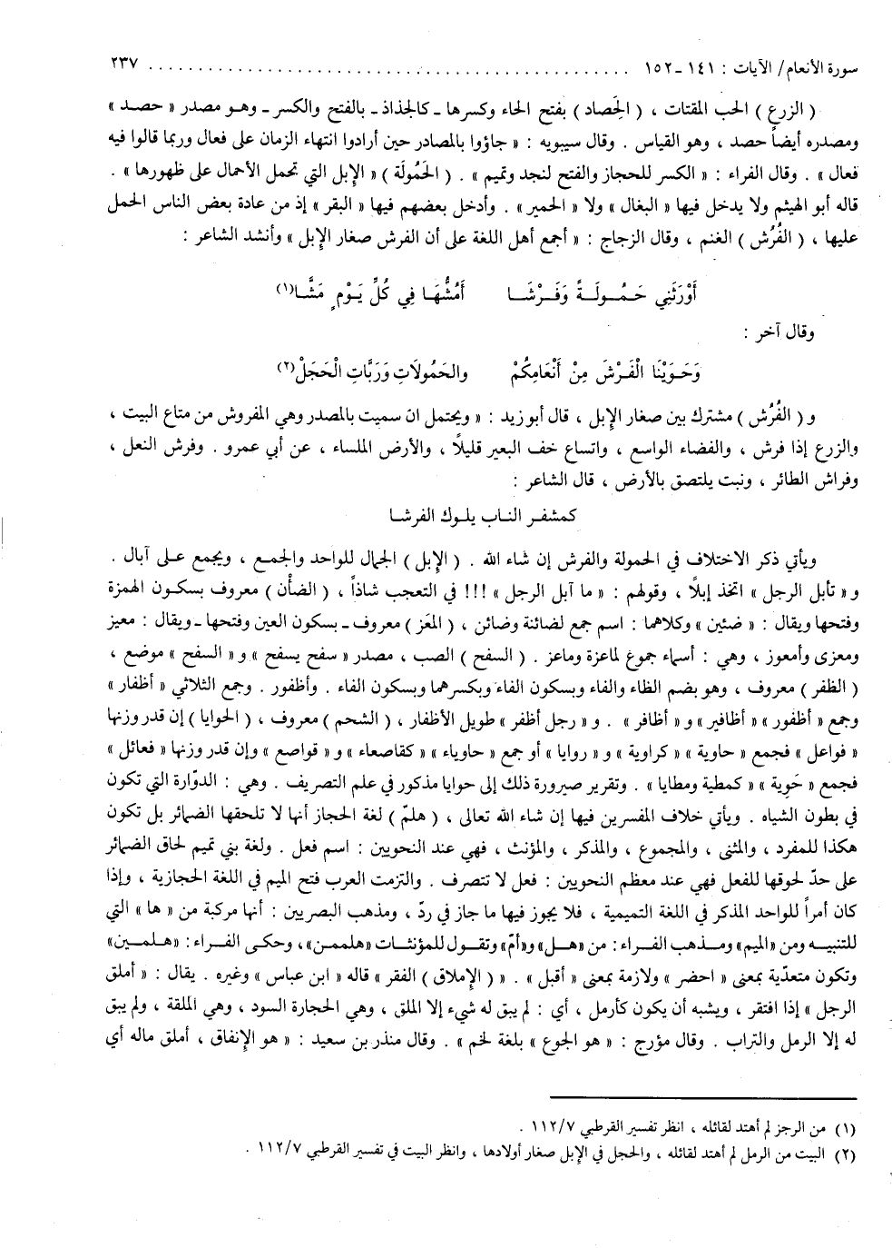 الزرع : الحب المقتات : الحصاد : بفتح الحاء وكسرها كالجذاذ بالفتح والكسر وهو مصدر حصد ومصدره أيضاً حصد وهو القياس . وقال سيبويه : جاؤوا بالمصادر حين أرادوا انتهاء الزمان على فعال وربما قالوا فيه فعال . وقال الفراء : الكسر للحجاز والفتح لنجد وتميم . الحمولة : الإبل التي تحمل الأحمال على ظهورها قاله أبو الهيثم ، ولا يدخل فيها البغال ولا الحمير وأدخل بعضهم فيها البقر إذ من عادة بعض الناس الحمل عليها . الفرش : الغنم . وقال الزجاج : أجمع أهل اللغة على أن الفرش صغار الإبل وأنشد الشاعر : أورثني حمولة وفرشا