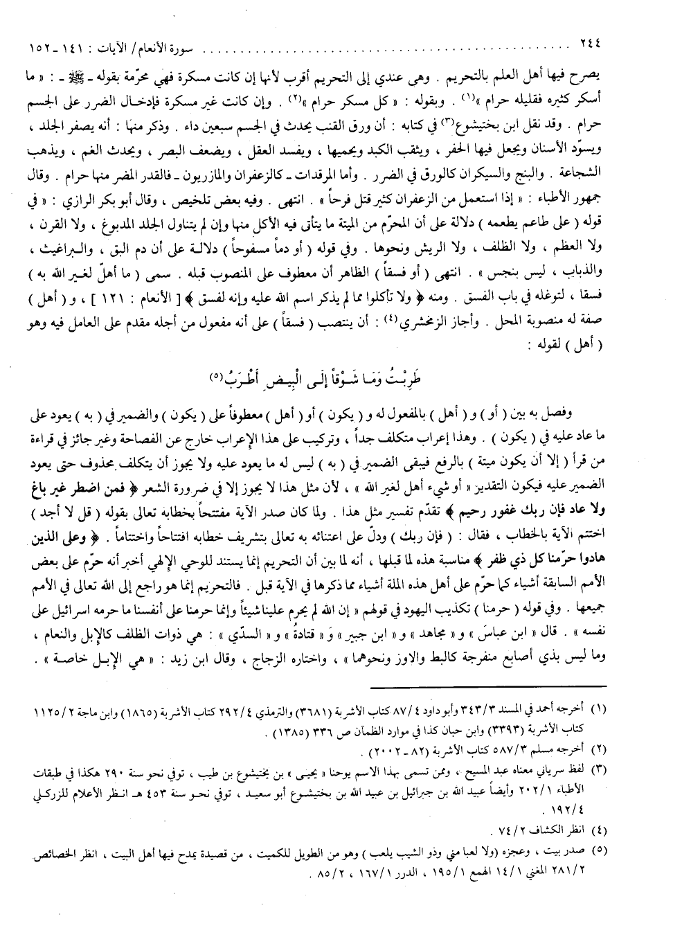 يصرح فيها أهل العلم بالتحريم وهي عندي إلى التحريم أقرب ، لأنها إن كانت مسكرة فهي محرّمة بقوله ( صلى الله عليه وسلم ) ) : ( ما أسكر كثيره فقليله حرام ) . وبقوله : ( كل مسكر حرام ) وإن كانت غير مسكرة فإدخال الضرر على الجسم حرام . وقد نقل ابن بخنتيشوع في كتابه : إن ورق القنب يحدث في الجسم سبعين داءً وذكر منها أنه يصفر الجلد ويسوّد الأسنان ويجعل فيها الحفر ويثقب الكبد ويحميها ويفسد العقل ويضعف البصر ويحدث الغم ويذهب الشجاعة والبنج ، والسيكران كالورق في الضرر وأما المرقدات كالزعفران والمازريون فالقدر المضر منها حرام ، وقال جمهور الأطباء : إذا استعمل من الزعفران كثير قتل فرحاً ؛ انتهى ، وفيه بعض تلخيص . وقال أبو بكر الرازي في قوله : ) عَلَى طَاعِمٍ يَطْعَمُهُ ( دلالة على أن المحرّم من الميتة ما يتأتى فيه الأكل منها وإن لم يتناول الجلد المدبوغ ولا القرن ولا العظم ولا الظلف ولا الريش ونحوها ، وفي قوله : ) أَوْ دَمًا مَّسْفُوحًا ( دلالة على أن دم البق والبراغيث والذباب ليس بنجس ؛ انتهى ) أَوْ فِسْقًا ( الظاهر أنه معطوف على المنصوب قبله سمى ما أهلّ لغير الله به فسقاً لتوغله في باب الفسق ومنه ) وَلاَ تَأْكُلُواْ مِمَّا لَمْ يُذْكَرِ اسْمُ اللَّهِ عَلَيْهِ ( وأنه لفسق وأهل صفة له منصوبة المحل وأجاز الزمخشري أن ينتصب فسقاً على أنه مفعول من أجله مقدم على العامل فيه وهو أهلّ لقوله .