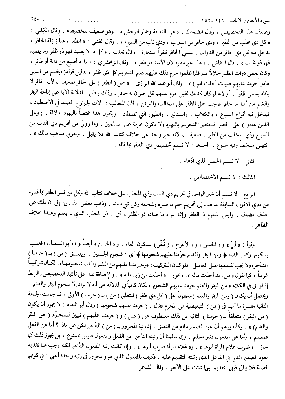 وضعف هذا التخصيص . وقال الضحاك : هي النعامة وحمار الوحش وهو ضعيف لتخصيصه . وقال الكلبي : كل ذي مخلب من الطير وذي حافر من الدواب وذي ناب من السباع . وقال القتبي : الظفر هنا بمنزلة الحافر يدخل فيه كل ذي حافر من الدواب سمى الحافر ظفر استعارة . وقال ثعلب : كل ما لا يصيد فهو ذو ظفر وما يصيد فهو ذو مخلب . قال النقاش : هذا غير مطرد لأن الأسد ذو ظفر . وقال الزمخشري : ما له أصبع من دابة أو طائر ، وكان بعض ذوات الظفر حلالاً لهم فلما ظلموا حرم ذلك عليهم فعم التحريم كل ذي ظفر بدليل قوله : ) فَبِظُلْمٍ مّنَ الَّذِينَ هَادُواْ حَرَّمْنَا عَلَيْهِمْ طَيّبَاتٍ أُحِلَّتْ لَهُمْ ). وقال أبو عبد الله الرازي : حمل الظفر على الحافر ضعيف لأن الحافر لا يكاد يسمى ظفراً ولأنه لو كان كذلك لقيل : حرم عليهم كل حيوان له حافر وذلك باطل لدلالة الآية على إباحة البقر والغنم مع أنها لها حافر ، فوجب حمل الظفر على المخالب والبراثن لأن المخالب آلات لجوارح الصيد في الاصطياد فيدخل فيه أنواع السباع والكلاب والسنانير والطيور التي تصطاد ويكون هذا مختصاً باليهود لدلالة ) وَعَلَى الَّذِينَ هَادُواْ ( على الحصر فيختص التحريم باليهود ولا تكون محرمة على المسلمين وما روي من تحريم ذي الناب من السباع وذي المخلب من الطير ضعيف ، لأنه خبر واحد على خلاف كتاب الله فلا يقبل ويقوي مذهب مالك ؛ انتهى ، ملخصاً وفيه منوع . أحدها : لا نسلم تخصيص ذي الظفر بما قاله . الثاني : لا نسلم الحصر الذي ادّعاه . الثالث : لا نسلم الاختصاص . الرابع : لا نسلم إن خبر الواحد في تحريم ذي الناب وذي المخلب على خلاف كتاب الله وكل من فسر الظفر بما فسره من ذوي الأقوال السابقة بذاهب إلى تحريم لحم ما فسره وشحمه وكل شيء منه . وذهب بعض المفسرين إلى أن ذلك على حذف مضاف وليس المحرم ذا الظفر وإنما المراد ما صاده ذو الظفر أي ذو المخلب الذي لم يعلم وهذا خلاف الظاهر . وقرأ أبي الحسن والأعرج ) ظُفُرٍ ( بسكون الفاء والحسن أيضاً وأبو السمال قعنب بسكونها وكسر الطاء .
