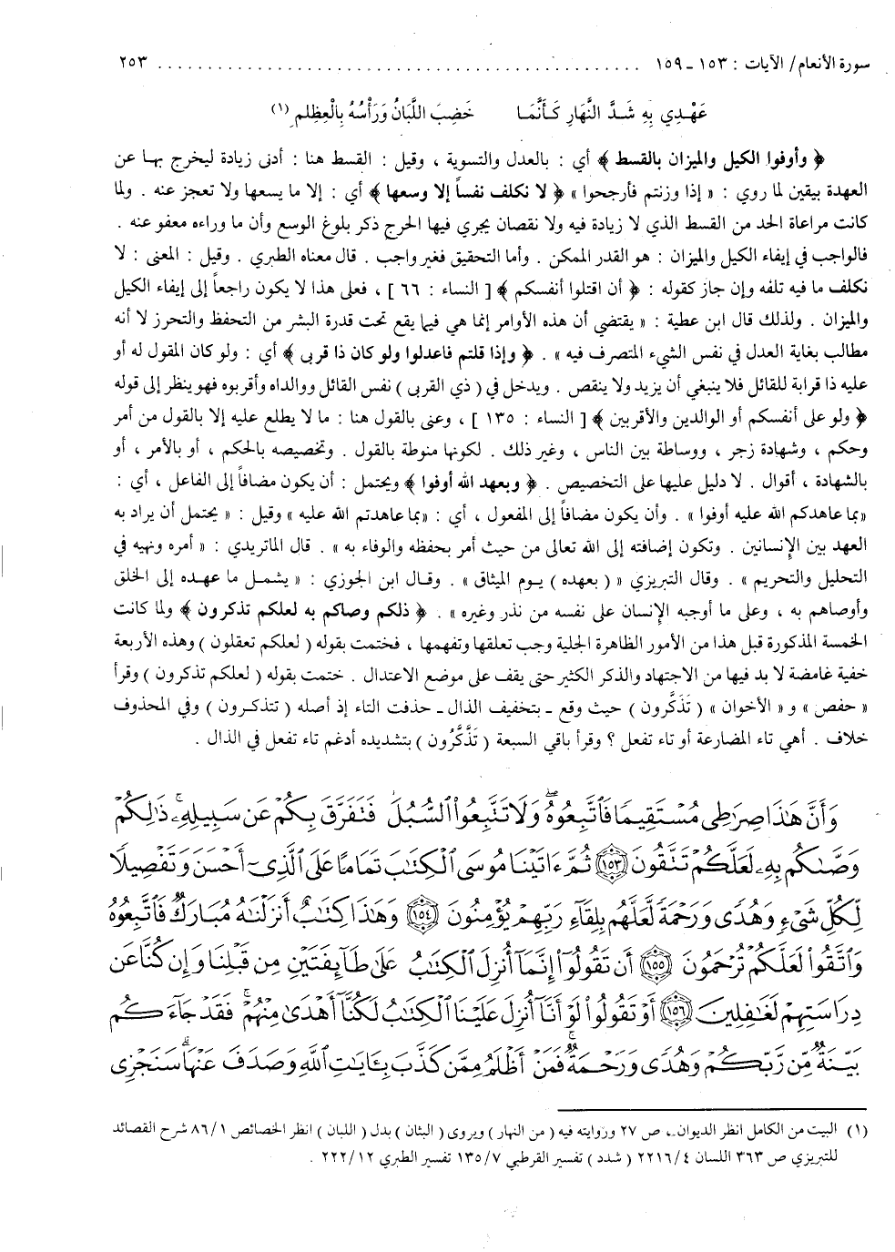 ) وَأَوْفُواْ الْكَيْلَ وَالْمِيزَانَ بِالْقِسْطِ ( أي بالعدل والتسوية . وقيل : القسط هنا أدنى زيادة ليخرج بها عن العهدة بيقين لما روي ( إذا وزنتم فأرجحوا ) .