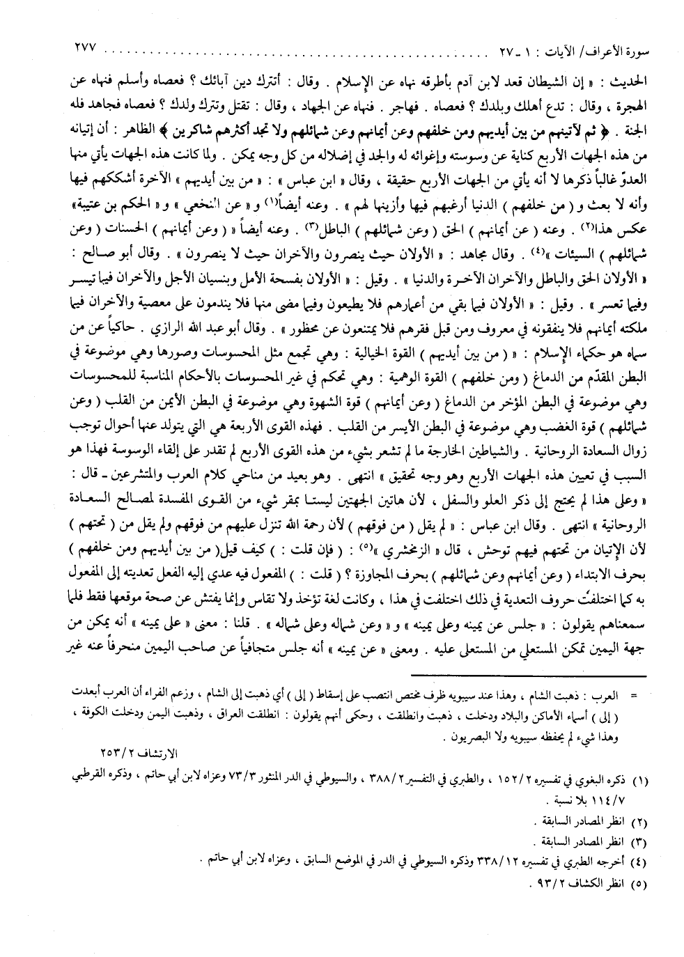 ( ثُمَّ لآتِيَنَّهُم مّن بَيْنِ أَيْدِيهِمْ وَمِنْ خَلْفِهِمْ وَعَنْ أَيْمَانِهِمْ وَعَن شَمَائِلِهِمْ وَلاَ تَجِدُ أَكْثَرَهُمْ شَاكِرِينَ ). الظاهر أنّ إتيانه من هذه الجهات الأربع كناية عن وسوسته وإغوائه له والجدّ في إضلاله من كل وجه يمكن ولما كانت هذه الجهات يأتي منها العدوّ غالباً ذكرها لا أنه يأتي من الجهات الأربع حقيقة ، وقال ابن عباس : ) مِن بَيْنِ أَيْدِيهِمْ الاْخِرَةَ ( أشككهم فيها وأنه لا بعث ) وَمِنْ خَلْفِهِمْ ( الدّنيا أرغبهم فيها وزيّنها لهم وعنه أيضاً وعن النخعي والحكم بن عتبة عكس هذا ، وعنه و ) عَنْ أَيْمَانِهِمْ ( الحقّ وعن ) شَمَائِلِهِمْ ( الباطل وعنه أيضاً : و ) عَنْ أَيْمَانِهِمْ ( الحسنات وعن ) شَمَائِلِهِمْ ( السيئات ، وقال مجاهد : الأوّلان حيث ينصرون والآخران حيث لا ينصرون ، وقال أبو صالح الأوّلان الحقّ والباطل والآخران الآخرة والدنيا ، وقيل : الأولان بفسحة الأمل وبنسيان الأجل والآخران فيما تيسر وفيما تعسر ، وقيل الأولان فيما بقي من أعمارهم فلا يطيعون وفيما مضى منها فلا يندمون على معصية والآخران فيما ملكته أيمانهم فلا ينفقونه في معروف ومن قبل فقرهم فلا يمتنعون عن محظور ، وقال أبو عبد الله الرازي حاكياً عن من سماه هو حكماء الإسلام من بين أيديهم القوة الخياليّة وهي تجمع مثل المحسوسات وصورها وهي موضوعة في البطن المقدّم من الدماغ ومن خلفهم القوة الوهميّة وهي تحكم في غير المحسوسات بالأحكام المناسبة للمحسوسات وهي موضوعة في البطن المؤخر من الدماغ وعن أيمانهم قوة الشهوة وهي موضوعة في البطن الأيمن من القلب وعن شمائلهم قوة الغضب وهي موضوعة في البطن الأيسر من القلب فهذه القوى الأربعة هي التي يتولد عنها أحوال توجب زوال السعادة الروحانية والشياطين الخارجة ما لم تشعر بشيء من هذه القوى الأربع لم تقدر على إلقاء الوسوسة فهذا هو السبب في تعيين هذه الجهات الأربع وهو وجه تحقيق انتهى ، وهو بعيد من مناحي كلام العرب والمتشرّعين قال : وعلى هذا لم يحتج إلى ذكر العلوّ والسّفل لأن هاتين الجهتين ليستا بمقرّ شيء من القوى المفسدة لمصالح السعادة الروحانية انتهى ، وقال ابن عباس : لم يقل من فوقهم لأن رحمة الله تنزل عليهم من فوقهم ولم يقل من تحتهم لأن الإتيان من تحتهم فيه توحش ، وقال الزمخشري : ( فإن قلت ) : كيف قيل ) مِن بَيْنِ أَيْدِيهِمْ ( ومن خلفهم بحرف الابتداء و ) عَنْ أَيْمَانِهِمْ وَعَن شَمَائِلِهِمْ ( بحرف المجاوزة ، ( قلت ) : المفعول فيه عدى إليه الفعل تعديته إلى المفعول به كما اختلفت حروف التعدية في ذلك اختلفت في هذا وكانت لغة تؤخذ ولا تقاس وإنما يفتش عن صحة موقعها فقط فلما سمعناهم يقولون : جلس عن يمينه وعلى يمينه وعن شماله وعلى شماله قلنا معنى على يمينه أنه يمكن من جهة اليمين تمكن المستعلى من المستعلي عليه ومعنى عن يمينه أنه جلس متجافياً عن صاحب اليمين منحرفاً عنه غير