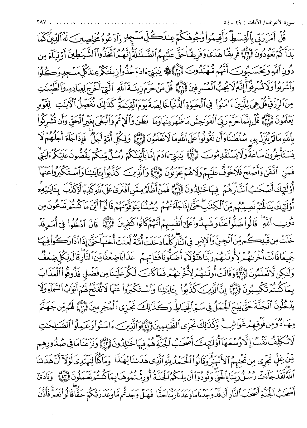 2 ( ) قُلْ أَمَرَ رَبِّي بِالْقِسْطِ وَأَقِيمُواْ وُجُوهَكُمْ عِندَ كُلِّ مَسْجِدٍ وَادْعُوهُ مُخْلِصِينَ لَهُ الدِّينَ كَمَا بَدَأَكُمْ تَعُودُونَ فَرِيقًا هَدَى وَفَرِيقًا حَقَّ عَلَيْهِمُ الضَّلَالَةُ إِنَّهُمُ اتَّخَذُوا الشَّيَاطِينَ أَوْلِيَآءَ مِن دُونِ اللَّهِ وَيَحْسَبُونَ أَنَّهُم مُّهْتَدُونَ يَابَنِىءَادَمَ خُذُواْ زِينَتَكُمْ عِندَ كُلِّ مَسْجِدٍ وكُلُواْ وَاشْرَبُواْ وَلاَ تُسْرِفُواْ إِنَّهُ لاَ يُحِبُّ الْمُسْرِفِينَ قُلْ مَنْ حَرَّمَ زِينَةَ اللَّهِ الَّتِىأَخْرَجَ لِعِبَادِهِ وَالْطَّيِّبَاتِ مِنَ الرِّزْقِ قُلْ هِى لِلَّذِينَ ءَامَنُواْ فِى الْحَيَواةِ الدُّنْيَا خَالِصَةً يَوْمَ الْقِيَامَةِ كَذَلِكَ نُفَصِّلُ الآيَاتِ لِقَوْمٍ يَعْلَمُونَ قُلْ إِنَّمَا حَرَّمَ رَبِّيَ الْفَوَاحِشَ مَا ظَهَرَ مِنْهَا وَمَا بَطَنَ وَالإِثْمَ وَالْبَغْىَ بِغَيْرِ الْحَقِّ وَأَن تُشْرِكُواْ بِاللَّهِ مَا لَمْ يُنَزِّلْ بِهِ سُلْطَاناً وَأَن تَقُولُواْ عَلَى اللَّهِ مَا لاَ تَعْلَمُونَ وَلِكُلِّ أُمَّةٍ أَجَلٌ فَإِذَا جَآءَ أَجَلُهُمْ لاَ يَسْتَأْخِرُونَ سَاعَةً وَلاَ يَسْتَقْدِمُونَ يَابَنِىآدَمَ إِمَّا يَأْتِيَنَّكُمْ رُسُلٌ مِّنكُمْ يَقُصُّونَ عَلَيْكُمْ ءَايَاتِى فَمَنِ اتَّقَى وَأَصْلَحَ فَلاَ خَوْفٌ عَلَيْهِمْ وَلاَ هُمْ يَحْزَنُونَ وَالَّذِينَ كَذَّبُواْ بِأايَاتِنَا وَاسْتَكْبَرُواْ عَنْهَآ أُوْلَائِكَ أَصْحَابُ النَّارِ هُمْ فِيهَا خَالِدُونَ فَمَنْ أَظْلَمُ مِمَّنِ افْتَرَى عَلَى اللَّهِ كَذِبًا أَوْ كَذَّبَ بِأايَاتِهِ أُوْلَائِكَ يَنَالُهُمْ نَصِيبُهُم مِّنَ الْكِتَابِ حَتَّى إِذَا جَآءَتْهُمْ رُسُلُنَا يَتَوَفَّوْنَهُمْ قَالُواْ أَيْنَ مَا كُنتُمْ تَدْعُونَ مِن دُونِ اللَّهِ قَالُواْ ضَلُّواْ عَنَّا وَشَهِدُواْ عَلَى أَنفُسِهِمْ أَنَّهُمْ كَانُواْ كَافِرِينَ قَالَ ادْخُلُواْ فِىأُمَمٍ قَدْ خَلَتْ مِن قَبْلِكُم مِّن الْجِنِّ وَالإِنْسِ فِى النَّارِ كُلَّمَا دَخَلَتْ أُمَّةٌ لَّعَنَتْ أُخْتَهَا حَتَّى إِذَا ادَّارَكُواْ فِيهَا جَمِيعًا قَالَتْ أُخْرَاهُمْ لاٍّ ولَاهُمْ رَبَّنَا هَاؤُلاءِ أَضَلُّونَا فَأاتِهِمْ عَذَابًا ضِعْفًا مِّنَ النَّارِ قَالَ لِكُلٍّ ضِعْفٌ وَلَاكِن لاَّ تَعْلَمُونَ وَقَالَتْ أُولَاهُمْ لاٌّ خْرَاهُمْ فَمَا كَانَ لَكُمْ عَلَيْنَا مِن فَضْلٍ فَذُوقُواْ الْعَذَابَ بِمَا كُنتُمْ تَكْسِبُونَ إِنَّ الَّذِينَ كَذَّبُواْ بِأايَاتِنَا وَاسْتَكْبَرُواْ عَنْهَا لاَ تُفَتَّحُ لَهُمْ أَبْوَابُ السَّمَآءِ وَلاَ يَدْخُلُونَ الْجَنَّةَ حَتَّى يَلِجَ الْجَمَلُ فِى سَمِّ الْخِيَاطِ وَكَذالِكَ نَجْزِى الْمُجْرِمِينَ لَهُم مِّن جَهَنَّمَ مِهَادٌ وَمِن فَوْقِهِمْ غَوَاشٍ وَكَذالِكَ نَجْزِى الظَّالِمِينَ وَالَّذِينَ ءَامَنُواْ وَعَمِلُواْ الصَّالِحَاتِ لاَ نُكَلِّفُ نَفْسًا إِلاَّ وُسْعَهَا أُوْلَائِكَ أَصْحَابُ الْجَنَّةِ هُمْ فِيهَا خَالِدُونَ وَنَزَعْنَا مَا فِى صُدُورِهِم مِّنْ غِلٍّ تَجْرِى مِن تَحْتِهِمُ الاٌّ نْهَارُ وَقَالُواْ الْحَمْدُ لِلَّهِ الَّذِى هَدَانَا لِهَاذَا وَمَا كُنَّا لِنَهْتَدِىَ لَوْلاأَنْ هَدَانَا اللَّهُ لَقَدْ جَآءَتْ رُسُلُ رَبِّنَا بِالْحَقِّ وَنُودُواْ أَن تِلْكُمُ الْجَنَّةُ أُورِثْتُمُوهَا بِمَا كُنتُمْ تَعْمَلُونَ وَنَادَىأَصْحَابُ الْجَنَّةِ أَصْحَابَ النَّارِ أَن قَدْ وَجَدْنَا مَا وَعَدَنَا رَبُّنَا حَقًّا فَهَلْ وَجَدتُّم مَّا وَعَدَ رَبُّكُمْ حَقًّا قَالُواْ نَعَمْ فَأَذَّن