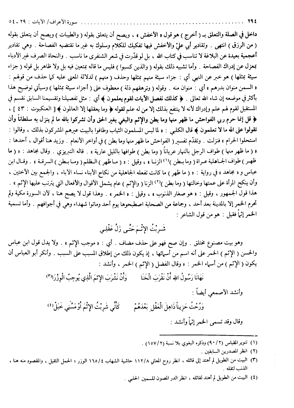 ( قُلْ إِنَّمَا حَرَّمَ رَبّيَ الْفَواحِشَ مَا ظَهَرَ مِنْهَا وَمَا بَطَنَ وَالإِثْمَ وَالْبَغْىَ بِغَيْرِ الْحَقّ وَأَن تُشْرِكُواْ بِاللَّهِ مَا لَمْ ( قال الكلبي لما لبس المسلمون الثياب وطافوا بالبيت عيّرهم المشركون بذلك وقالوا استحلوا الحرم فنزلت ، وتقدّم تفسير ) الْفَواحِشَ مَا ظَهَرَ مِنْهَا وَمَا بَطَنَ ( في أواخر الأنعام وزيد هنا أقوال ، أحدها : ) مَا ظَهَرَ مِنْهَا ( طواف الرّجل بالنهار عرياناً ) وَمَا بَطَنَ ( طوافها بالليل عارية قاله التبريزي ، وقال مجاهد : ) مَا ظَهَرَ ( طواف الجاهلية عراة ) وَمَا بَطَنَ ( الزنا ، وقيل : ) مَا ظَهَرَ ( الظلم ) وَمَا بَطَنَ ( السّرقة ، وقال ابن عباس ومجاهد في رواية : ) مَا ظَهَرَ ( ما كانت تفعله الجاهلية من نكاح الأباء نساء الآباء والجمع بين الأختين وأن ينكح المرأة على عمتها وخالتها ) وَمَا بَطَنَ ( الزّنا ) وَالإِثْمَ ( عام يشمل الأقوال والأفعال التي يترتب عليها الإثم ، هذا قول الجمهور ، وقيل هو صغار الذنوب ، وقيل : الخمر ، وهذا قول لا يصح هنا لأن السّورة مكية ولم تحرم الخمر إلا بالمدينة بعد أحد وجماعة من الصحابة اصطبحوها يوم أحد وماتوا شهداء وهي في أجوافهم وأما تسمية الخمر إثماً فقيل هو من قول الشاعر :