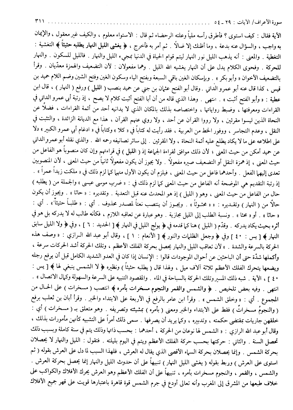 ( إِنَّ رَبَّكُمُ اللَّهُ الَّذِى خَلَقَ ( التغشية التغطية والمعنى أنه يذهب الليل نور النهار ليتم قوام الحياة في الدنيا بمجيء الليل والنهار فالليل للسكون والنهار للحركة وفحوى الكلام يدلّ على أنّ النهار يغشيه الله الليل وهما مفعولان لأنّ التضعيف والهمزة معدّيان ، وقرأ بالتضعيف الأخوان وأبو بكر وبإسكان الغين باقي السبعة وبفتح الياء وسكون الغين وفتح الشين وضم اللام حميد بن قيس كذا قال عنه أبو عمرو الداني ، وقال أبو الفتح عثمان بن جني عن حميد بنصب ) الَّيْلَ ( ورفع ) النَّهَارَ ( ، قال ابن عطية وأبو الفتح أثبت انتهى وهذا الذي قاله من أنّ أبا الفتح أثبت كلام لا يصح إذ رتبة أبي عمرو الداني في القراءات ومعرفتها وضبط رواياتها واختصاصه بذلك بالمكان الذي لا يدانيه أحد من أثمة القراءات فضلاً عن النحاة الذين ليسوا مقرئي ولا رووا القرآن عن أحد ولا روي عنهم القرآن هذا مع الديانة الزائدة والتثبت في النّقل وعدم التجاسر ووفور الخط من العربية فقد رأيت له كتاباً في كلا وكتاباً في إدغام أبي عمرو الكبير دلاًّ على إطلاعه على ما لا يكاد يطلع عليه أثمة النحاة ولا المقرئين إلى سائر تصانيفه رحمه الله والذي نقله أبو عمرو الداني عن حميد أمكن من حيث المعنى لأنّ ذلك موافق لقراءة الجماعة إذ الليل في قراءتهم وإن كان منصوباً هو الفاعل من حيث المعنى إذ همزة النقل أو التضعيف صيره مفعولاً ولا يجوز أن يكون مفعولاً ثانياً من حيث المعنى لأن المنصوبين تعدّى إليهما الفعل وأحدهما فاعل من حيث المعنى فيلزم أن يكون الأول منهما كما لزم ذلك في ملكت زيداً عمراً إذ رتبة التقديم هي الموضّحة أنه الفاعل من حيث المعنى كما لزم ذلك في ضرب موسى عيسى والجملة من يطلبه حال من الفاعل من حيث المعنى وهو الليل إذ هو المحدث عنه قبل التعدية وتقديره حاثاً ويجوز أن يكون حالاً من النهار وتقديره محثوثاً ويجوز أن ينتصب نعتاً لمصدر محذوف أي طلباً حثيثاً أي حثاً أو محثاً ونسبة الطلب إلى الليل مجازية وهو عبارة عن تعاقبه اللازم فكأنه طالب له لا يدركه بل هو في إثره بحيث يكاد يدركه وقدّم الليل هنا كما قدمه في ) يُولِجُ الَّيْلَ فِى النَّهَارِ ( وفي ) وَلاَ الَّيْلُ سَابِقُ النَّهَارِ ( وفي ) وَجَعَلَ الظُّلُمَاتِ وَالنُّورَ ( ، وقال أبو عبد الله الرازي وصف هذه الحركة بالسرعة والشدة لأنّ تعاقب الليل والنهار يحصل بحركة الفلك الأعظم وتلك الحركة أشد الحركات سرعة وأكملها شدّة حتى إنّ الباحثين عن أحوال الموجودات قالوا : الإنسان إذا كان في العدو الشديد الكامل قبل أن يرفع رجله ويضعها يتحرك الفلك الأعظم ثلاثة آلاف ميل ولهذا قال : ) يَطْلُبُهُ حَثِيثًا ( ونظيره ) لاَ الشَّمْسُ يَنبَغِى لَهَا ( الآية شبه ذلك المسير وتلك الحركة بالسباحة في الماء والمقصود التنبيه على السرعة والسهولة وكمال الاتصال انتهى وفيه بعض تلخيص .