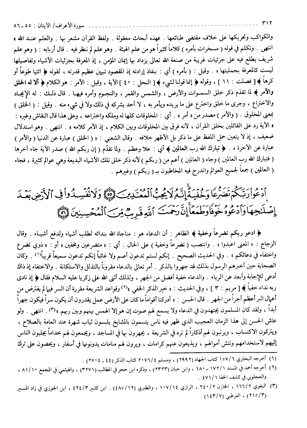 ( ادْعُواْ رَبَّكُمْ تَضَرُّعًا وَخُفْيَةً ( الظاهر أنّ الدعاء هو مناجاة الله بندائه لطلب أشياء ولدفع أشياء ، وقال الزّجاج : المعنى اعبدوا وانتصب ) تَضَرُّعًا وَخُفْيَةً ( على الحال أي متضرّعين ومخفين أو ذوي تضرّع واختفاء في دعائكم وفي الحديث الصحيح ( إنكم لستم تدعون أصم ولا غائباً إنكم تدعون سميعاً قريباً ) وكان الصحابة حين أخبرهم الرسول بذلك قد جهروا بالذكر أمر تعالى بالدعاء مقروناً بالتذلل والاستكانة والاختفاء إذ ذاك ادّعى للإجابة وأبعد عن الرياء والدعاء خفية أفضل من الجهر ولذلك أثنى الله على زكريا عليه السلام فقال : ) إِذْ نَادَى رَبَّهُ نِدَاء خَفِيّاً ( وفي الحديث ( خير الذّكر الخفي ) وقواعد الشريعة مقررة أن السرّ فيما لم يفترض من أعمال البر أعظم أجراً من الجهر . قال الحسن : أدركنا أقواماً ما كان على الأرض عمل يقدرون أن يكون سراً فيكون جهراً أبداً ولقد كان المسلمون يجتهدون في الدعاء ولا يسمع لهم صوت إن هو إلا الهمس بينهم وبين ربهم انتهى ولو عاش الحسن إلى هذا الزمان العجيب الذي ظهر فيه ناس يتسمون بالمشايخ يلبسون ثياب شهرة عند العامة بالصّلاح ويتركون الاكتساب ويرتبون لهم إذكاراً لم ترد في الشريعة يجهرون بها في المساجد ويجمعون لهم خداماً يجلبون الناس إليهم لاستخدامهم ونتش أموالهم ويذيعون عنهم كرامات ويرون لهم منامات يدوّنونها في أسفار ويحضون على ترك