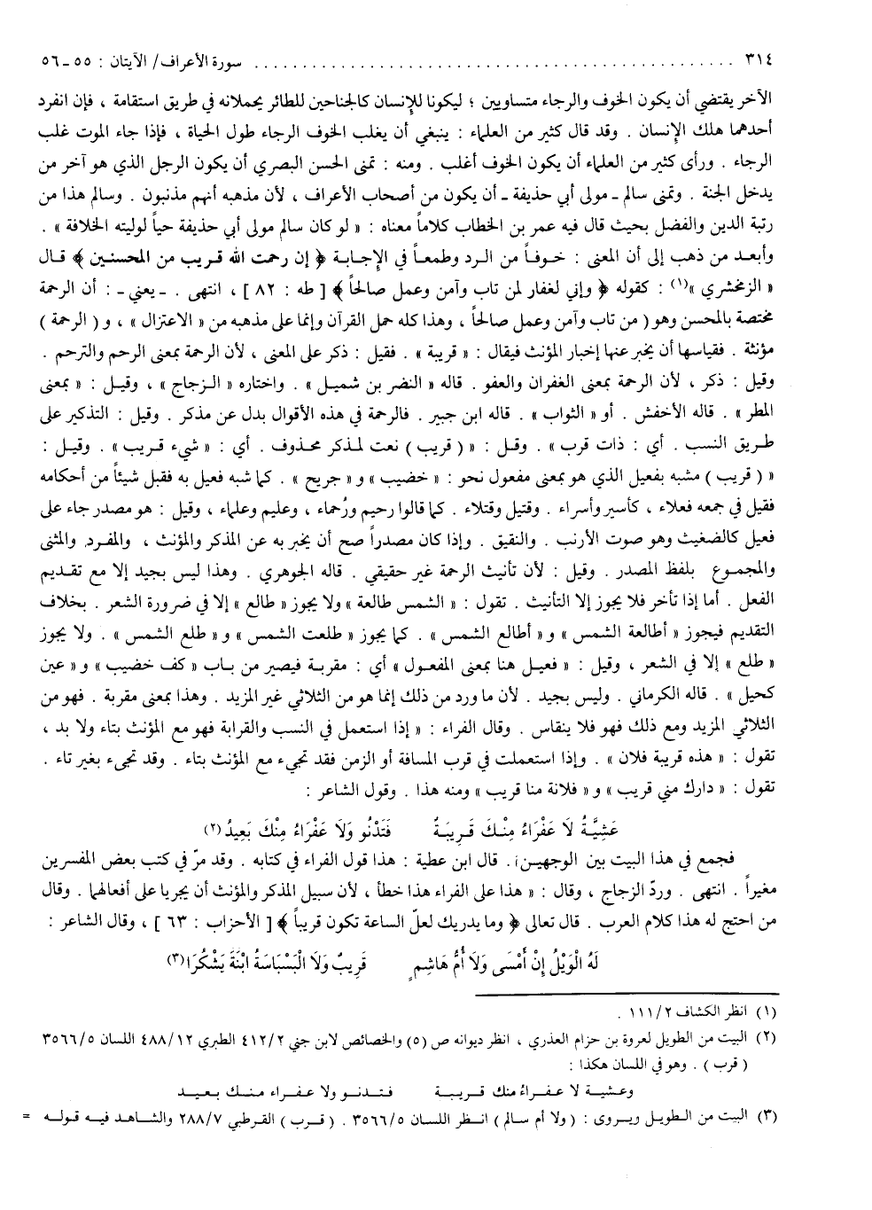 ( وَلاَ تُفْسِدُواْ فِى الاْرْضِ بَعْدَ إِصْلَاحِهَا ( قال الزمخشري : كقوله : ) وَإِنّى لَغَفَّارٌ لّمَن تَابَ وَامَنَ وَعَمِلَ صَالِحَاً ( ، انتهى . يعني أنّ الرحمة مختصة بالمحسن وهو من تاب وآمن وعمل صالحاً وهذا كله حمل القرآن وإنما على مذهبه من الاعتزال والرحمة مؤنثة فقياسها أن يخبر عنها إخبار المؤنّث فيقال قريبة ، فقيل : ذكر على المعنى لأنّ الرحمة بمعنى الرحم والترحّم ، وقيل : ذكر لأنّ الرحمة بمعنى الغفران والعفو قاله النضر بن شميل واختاره الزّجاج ، وقيل بمعنى المطر قاله الأخفش أو الثواب قاله ابن جبير فالرحمة في هذه الأقوال بدل عن مذكر . وقيل : التذكير على طريق النسب أي ذات قرب ، وقيل : قريب نعت لمذكر محذوف أي شيء قريب ، وقيل : قريب مشبّه بفعيل الذي هو بمعنى مفعول نحو خصيب وجريح كما شبه فعيل به فقيل شيئاً من أحكامه فقيل في جمعه فعلاء كأسير وأسراء وقتيل وقتلاء كما قالوا : رحيم ورحماء وعليم وعلماء ، وقيل : هو مصدر جاء على فعيل كالضغيث وهو صوت الأرنب والنقيق وإذا كان مصدر أصح أن يخبر به عن المذكر والمؤنث والمفرد والمثنى والمجموع بلفظ المصدر ، وقيل لأن تأنيث الرحمة غير حقيقي قاله الجوهري ، وهذا ليس بجيد إلاّ مع تقديم الفعل أما إذا تأخر فلا يجوز إلا التأنيث تقول الشمس طالعة ولا يجوز طالع إلا في ضرورة الشعر بخلاف التقديم فيجوز أطالعة الشمس وأطالع الشمس كما يجوز طلعت الشمس وطلع الشمس ولا يجوز طلع إلا في الشّعر ، وقيل : فعيل هنا بمعنى المفعول أي مقربة فيصير من باب كفّ خضيب وعين كحيل قاله الكرماني ، وليس بجيد لأن ما ورد من ذلك إنما هو من الثلاثي غير المزيد وهذا بمعنى مقربة فهو من الثلاثي المزيد ومع ذلك فهو لا ينقاس ، وقال الفرّاء إذا استعمل في النسب والقرابة فهو مع المؤنث بتاء ولا بدّ تقول هذه قريبة فلان وإن استعملت في قرب المسافة أو الزمن فقد تجيء مع المؤنث بتاء وقد تجيء بغير تاء تقول دارك مني قريب وفلانة منا قريب ، ومنه هذا وقول الشاعر : عشية لا عفراء منك قريبة