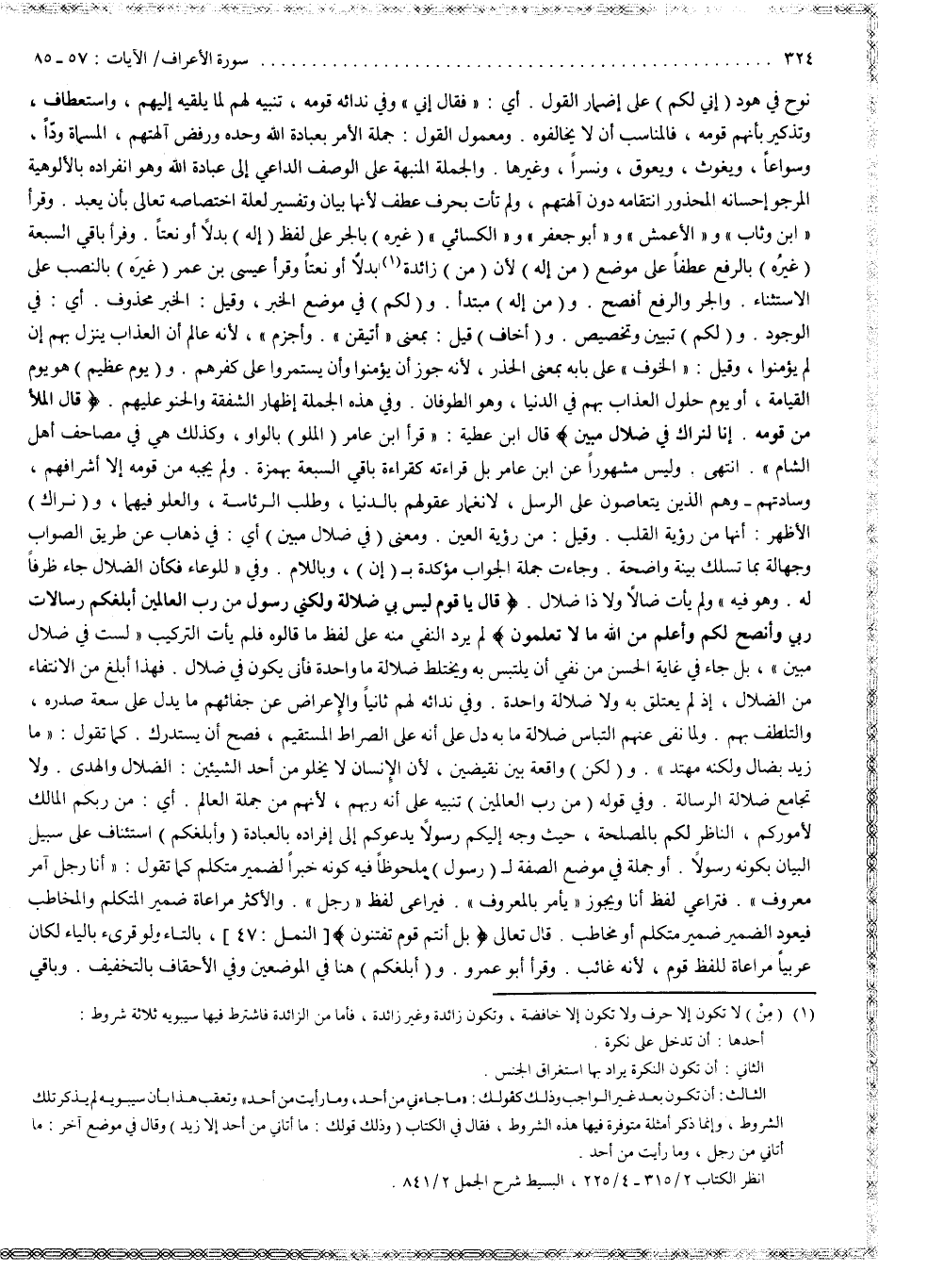 نوح في هود ) إِنِّي لَكُمْ ( على إضمار القول أي فقال إني وفي ندائه قومه تنبيه لهم لما يلقيه إليهم واستعطاف وتذكير بأنهم قومه فالمناسب أن لا يخالفوه ومعمول القول جملة الأمر بعبادة الله وحده ورفض آلهتهم المسمّاة ودّاً وسواعاً ويغوث ويعوق ونسراً وغيرها والجملة المنبهة على الوصف الدّاعي إلى عبادة الله وهو انفراده بالألوهية المرجو إحسانه المحذور انتقامه دون آلهتهم ولم تأتِ بحرف عطف لأنها بيان وتفسير لعلّة اختصاصه تعالى بأن يعبد ، وقرأ ابن وثاب الأعمش وأبو جعفر والكسائي غيره بالجرّ على لفظ ) إِلَهٍ ( بدلاً أو نعتاً ، وقرأ باقي السّبعة غيره بالرفع عطفاً على موضع ) مِنْ إِلَهٍ ( لأنّ من زائدة بدلاً أو نعتاً ، وقرأ عيسى بن عمر غيره بالنصب على الاستثناء والجرّ والرفع أفصح ) وَمِنْ إِلَهٍ ( مبتدأ و ) لَكُمْ ( في موضع الخبر ، وقيل : الخبر محذوف أي في الوجود و ) لَكُمْ ( تبيين وتخصيص ، و ) أَخَافُ ( قيل : بمعنى أتيقن وأجزم لأنه عالم أن العذاب بنزل بهم إن لم يؤمنوا ، وقيل : الخوف على بابه بمعنى الحذر لأنه جوّز أن يؤمنوا وأن يستمروا على كفرهم و ) يَوْمٍ عَظِيمٍ ( هو يوم القيامة أو يوم حلول العذاب بهم في الدنيا وهو الطوفان وفي هذه الجملة إظهار الشّفقة والحنوّ عليهم .