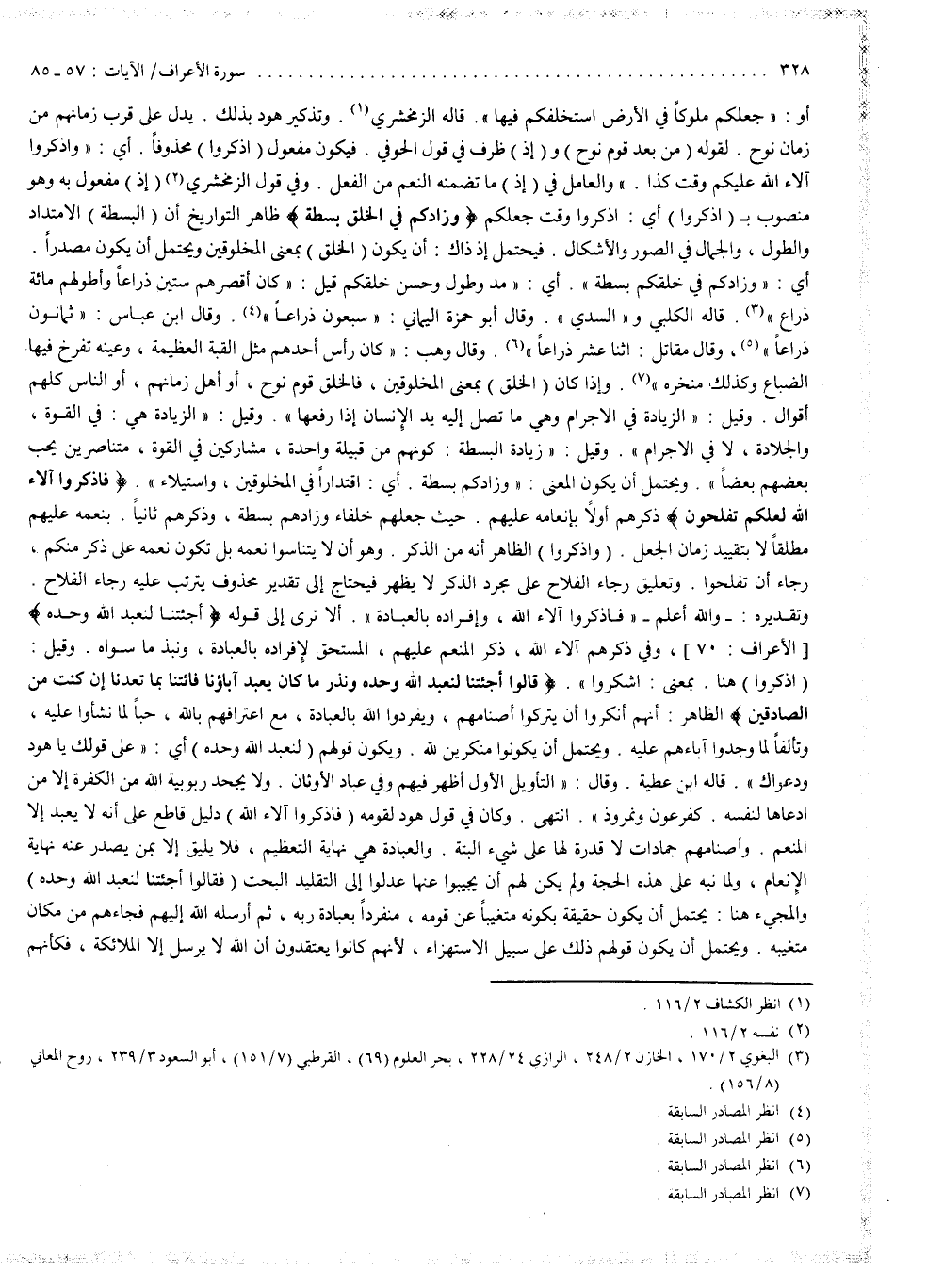 ( وَزَادَكُمْ فِى الْخَلْقِ بَسْطَةً ( ظاهر التواريخ أنّ البسطة الامتداد والطول والجمال في الصور والأشكال فيحتمل إذ ذاك أن يكون الخلق بمعنى المخلوقين ويحتمل أن يكون مصدراً أي وزادكم في خلقكم بسطة أي مد وطول حسن خلقكم قيل : كان أقصرهم ستين ذراعاً وأطولهم مائة ذراع قاله الكلبي والسدّي ، وقال أبو حمزة اليماني : سبعون ذراعاً . وقال ابن عباس ثمانون ذراعاً . وقال مقاتل : اثنا عشر ذراعاً . وقال وهب : كان رأس أحدهم مثل القبة العظيمة وعينه تفرخ فيها الضباع وكذلك منخره وإذا كان الخلق بمعنى المخلوقين فالخلق قوم نوح أو أهل زمانهم أو الناس كلهم أقوال ، وقيل : الزيادة في الإجرام وهي ما تصل إليه يد الإنسان إذا رفعها ، وقيل الزيادة هي في القوة والجلادة لا في الإجرام . وقيل : زيادة البسطة كونهم من قبيلة واحدة مشاركين في القوة متناصرين يحبّ بعضهم بعضاً ويحتمل أن يكون المعنى ) وَزَادَكُمْ بَسْطَةً ( أي اقتداراً في المخلوقين واستيلاء .