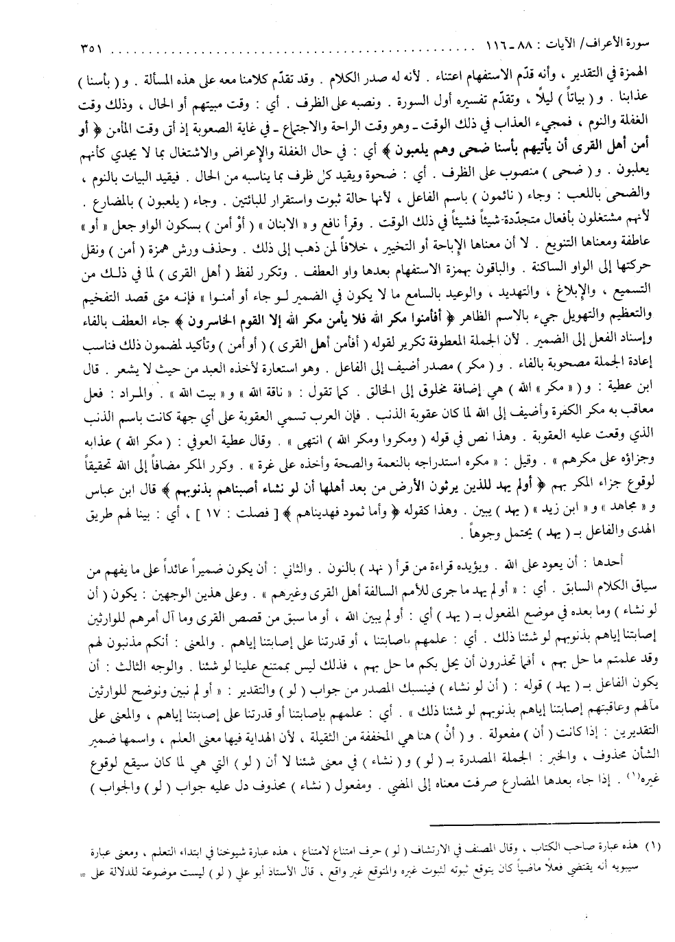 ( أَوَ أَمِنَ أَهْلُ الْقُرَى أَن يَأْتِيَهُمْ بَأْسُنَا ضُحًى وَهُمْ يَلْعَبُونَ ( أي في حال الغفلة والإعراض والاشتغال بما لا يجدي كأنهم يلعبون ) وضحى ( منصوب على الظرف أي صحوة ويقيد كل ظرف بما يناسبة من الحال فيقيد البيات بالنوم والضحى باللعب وجاء ) وَهُمْ نَائِمُونَ ( باسم الفاعل لأنها حالة ثبوت واستقرار للبائنين وجاء ) يَلْعَبُونَ ( بالمضارع لأنهم مشتغلون بأفعال متجدّدة شيئاً فشيئاً في ذلك الوقت ، وقرأ نافع والابنان ) أَوَ أَمِنَ ( بسكون الواو جعل أو عاطفة ومعناها التنويع لا أنّ معناها الإباحة أو التخيير خلافاً لمن ذهب إلى ذلك وحذف ورش همزة أمن ونقل حركتها إلى الواو الساكنة والباقون بهمزة الاستفهام بعدها واو العطف وتكرر لفظ ) أَهْلَ الْقُرَى ( لما في ذلك من التسميع والإبلاغ والتهديد والوعيد بالسامع ما لا يكون في الضمير لو جاء أو أمنوا فإنه متى قصد التفخيم والتعظيم والتهويل جيء بالاسم الظاهر .
