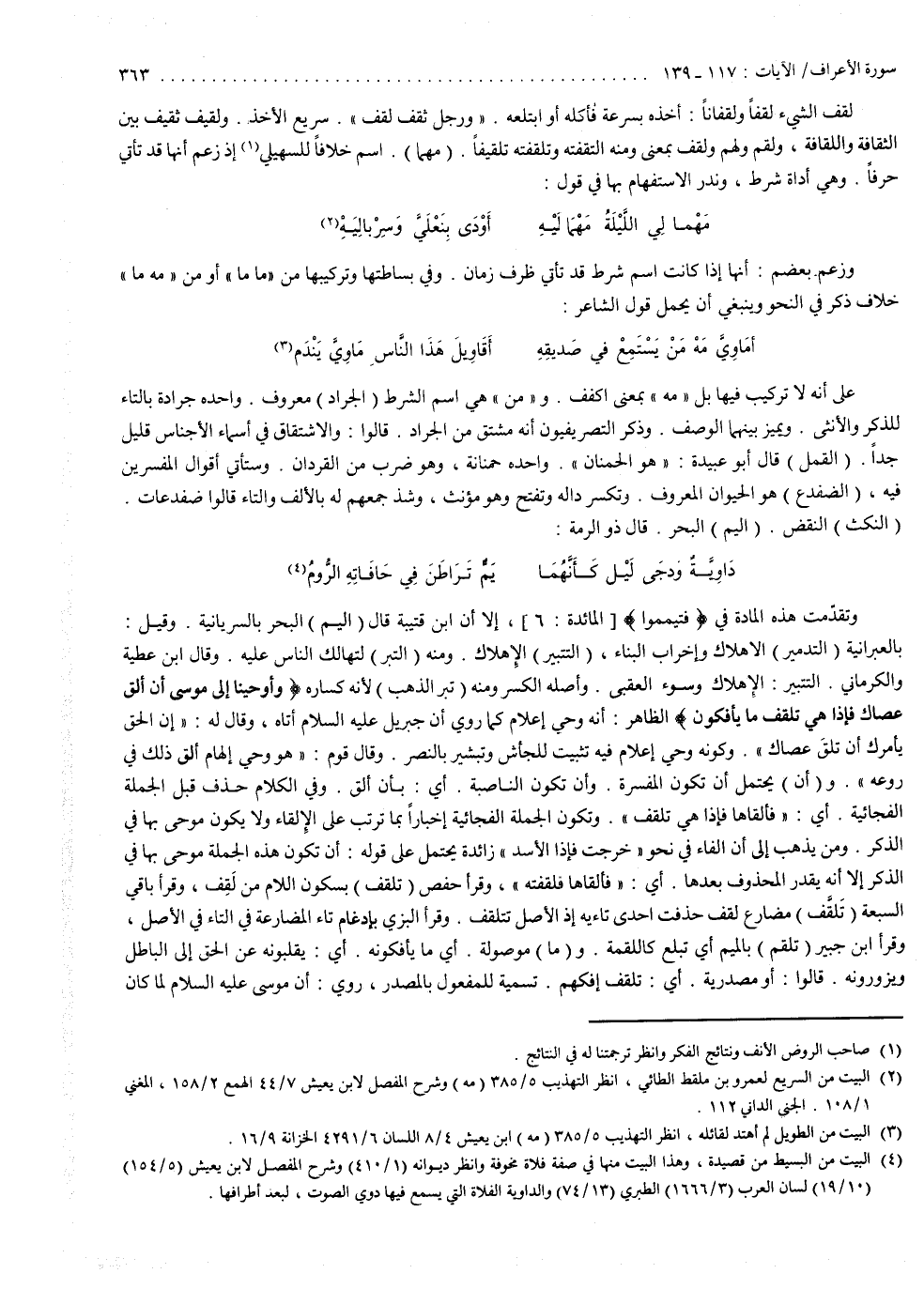 لقف الشيء لقفاً ولقفاناً أخذه بسرعة فأكله أو ابتلعه ورجل ثقف لقف سريع الأخذ ولقيف ثقيف بين الثقافة واللقافة ولقم ولهم ولقف بمعنى ومنه التقفته وتلقفته تلقيفاً . مهما اسم خلافاً للسهيلي إذ زعم أنها قد تأتي حرفاً وهي أداة شرط وندر الاستفهام بها في قوله : مهما لي الليلة مهماليه