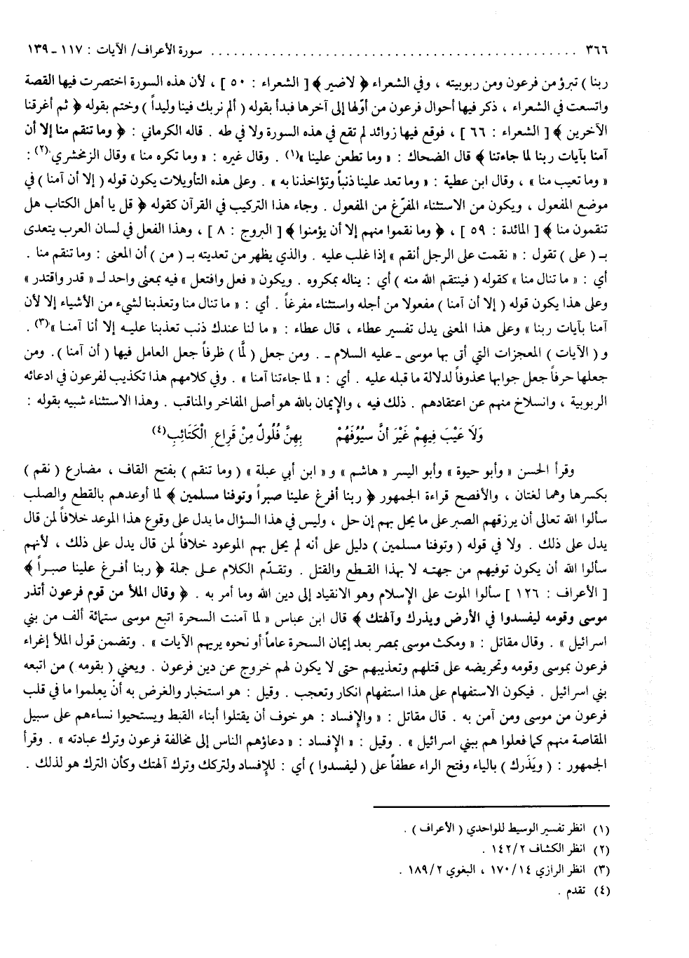 ( وَمَا تَنقِمُ مِنَّا إِلا أَنْ ءامَنَّا بِئَايَاتِ رَبّنَا لَمَّا جَاءتْنَا ( قال الضحاك : وما تطعن علينا ، وقال غيره : وما تكره منا ، وقال الزمخشري : وما تعيب منا ، وقال ابن عطية : وما تعد علينا ذنباً وتؤاخذنا به وعلى هذه التأويلات يكون قوله ) قُلْ يَاأَهْلَ الْكِتَابِ ( في موضع المفعول ويكون من الاستثناء المفرّغ من المفعول وجاء هذا التركيب في القرآن كقوله ) قُلْ ياأَهْلَ أَهْلِ الْكِتَابِ هَلْ تَنقِمُونَ مِنَّا ( ) وَمَا نَقَمُواْ مِنْهُمْ إِلاَّ أَن يُؤْمِنُواْ ( وهذا الفعل في لسان العرب يتعدّى بعلى تقول نقمت على الرجل أنقم إذا غلب عليه والذي يظهر من تعديته بمن أنّ المعنى وما تنقم منا أي ما تنال منا كقوله فينتقم الله منه أي يناله بمكروه ويكون فعل وافتعل فيه بمعنى واحد كقدر واقتدر وعلى هذا يكون قوله ) قُلْ يَاأَهْلَ الْكِتَابِ ( مفعولاً من أجله واستثناء مفرّغاً أي ما تنال منا وتعذّبنا لشيء من الأشياء إلا لأن آمنا بآيات ربنا وعلى هذا المعنى يدل تفسير عطاء ، قال عطاء : أي ما لنا عندك ذنب تعذّبنا عليه إلا أنّا آمنا ، والآيات المعجزات التي أتى بها موسى عليه السلام ومن جعل لما ظرفاً جعل العامل فيها ) مِنَّا إِلاَّ ( ومن جعلها حرفاً جعل جوابها محذوفاً لدلالة ما قبله عليه أي لما جاءتنا آمنا وفي كلامهم هذا تكذيب لفرعون في ادعائه الرّبوبية وانسلاخ منهم عن اعتقادهم ذلك فيه والإيمان بالله هو أصل المفاخر والمناقب وهذا الاستثناء شبيه بقوله : ولا عيب فيهم غير أنّ سيوفهم