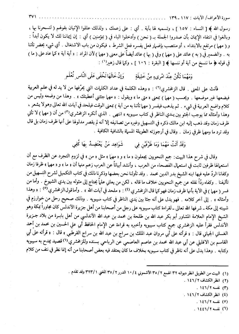 وقال في شرح هذا البيت جميع النحويين يجعلون ما ومهما مثل من في لزوم التجرّد عن الظرف مع أنّ استعمالها ظرفين ثابت في استعمال الفصحاء من العرب وأنشد أبياتاً عن العرب زعم منها أنّ ما ومهما ظرفا زمان وكفانا الرّد عليه فيها ابنه الشيخ بدر الدين محمد وقد تأوّلنا نحن بعضها وذكرنا ذلك في كتاب التكميل لشرح التسهيل من تأليفنا وكفاه ردّاً نقله عن جميع النحويين خلاف ما قاله لكن من يعاني علماً يحتاج إلى مثوله بين يدي الشيوخ وأما من فسّر مهما في الآية بأنها ظرف زمان فهو كما قال الزمخشري ملحد في آيات الله وأما قول الزمخشري وهذا وأمثاله إلى آخر كلامه فهو يدلّ على أنه جثا بين يدي الناظر في كتاب سيبويه وذلك صحيح رحل من خوارزم في شيبته إلى مكة شرفها الله تعالى لقراءة كتاب سيبويه على رجل من أصحابنا من أهل جزيرة الأندلس كان مجاوراً بمكة وهو الشيخ الإمام العلاّمة المشاور أبو بكر عبد الله بن طلحة بن محمد بن عبد الله الأندلسي من أهل بابرة من بلاد جزيرة الأندلس فقرأ عليه الزمخشري جميع كتاب سيبويه وأخبره به قراءة عن الإمام الحافظ أبي علي الحسين بن محمد بن أحمد الغساني الجياني قال قرأته على أبي مروان عبد الملك بن سراج بن عبد الله بن سراج القرطبي قال قرأته على أبي القاسم بن الإفليلي عن أبي عبد الله محمد بن عاصم العاصمي عن الرباحي بسنده ، وللزمخشري قصيد يمدح به سيبويه وكتابه وهذا يدلّ على أنه ناظر في كتاب سيبويه بخلاف ما كان يعتقد فيه بعض أصحابنا من أنه إنما نظر في نتف من كلام