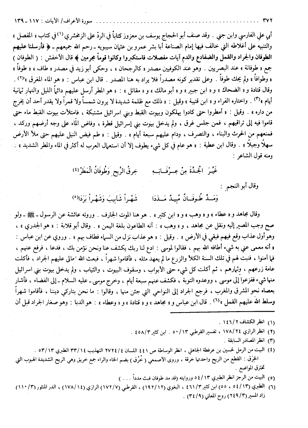 وقال مجاهد وعطاء ووهب وابن كثير هو هنا الموت الجارف وروته عائشة عن الرسول ( صلى الله عليه وسلم ) ) ولو صحّ وجب المصير إليه ونقل عن مجاهد ووهب أنه الطاعون بلغة اليمن ، وقال أبو قلابة هو الجدري وهو أول عذاب وقع فيهم فبقي في الأرض . وقيل هو عذاب نزل من السماء فطاف بهم ، وروي عن ابن عباس أنه معمى عنى به شيء أطافه الله بهم فقالوا لموسى ادع لنا ربك يكشف عنا ونحن نؤمن بك فدعا فرفع عنهم فما آمنوا فنبت لهم في تلك السنة من الكلأ والزرع ما لم يعهد مثله فأقاموا شهرباً فبعث الله تعالى عليهم الجراد فأكلت عامة زرعهم وثمارهم ثم أكلت كل شيء حتى الأبواب وسقوف البيوت والثياب ولم يدخل بيوت بني إسرائيل منها شيء ففزعوا إلى موسى ووعدوه التوبة فكشف عنهم سبعة أيام وخرج موسى عليه السلام إلى الفضاء فأشار بعصاه نحو المشرق والمغرب فرجع الجراد إلى النواحي التي جئن منها وقالوا ما نحن بتاركي ديننا فأقاموا شهراً وسلّط عليهم القمل ، قال ابن عباس ومجاهد وقتادة وعطاء : هو الدّبا وهو صغار الجراد قبل أن