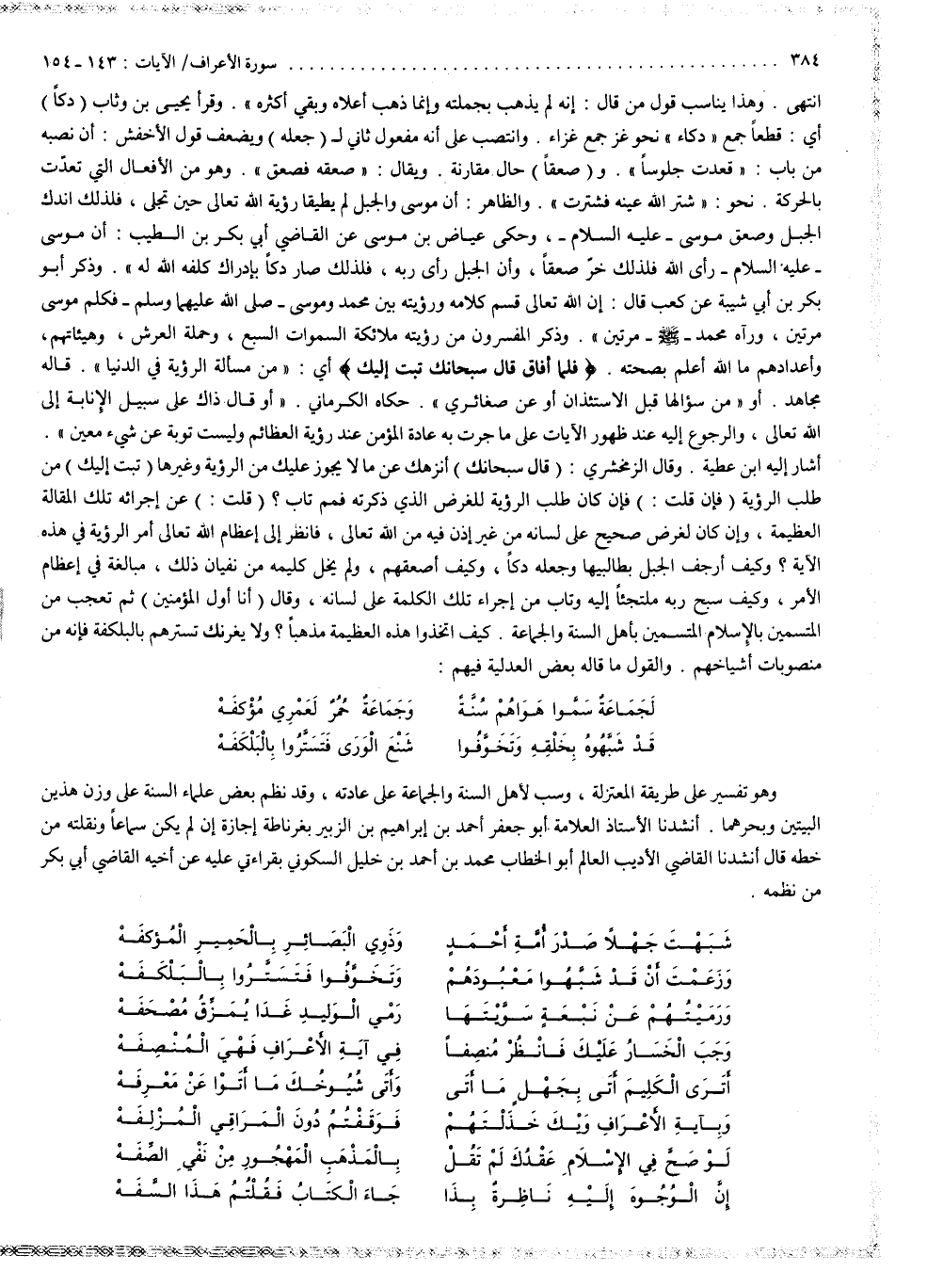 وهو تفسير على طريقة المعتزلة وسبّ لأهل السنة والجماعة على عادته وقد نظم بعض علماء السنة على وزن هذين البيتين وبحرهما أنشدنا الأستاذ العلامة أبو جعفر أحمد بن إبراهيم بن الزبير بغرناطة إجازة إن لم يكن سماعاً ونقلته من خطّه ، قال أنشدنا القاضي الأديب العالم أبو الخطاب محمد بن أحمد بن خليل السكوني بقراءتي عليه عن أخيه القاضي أبي بكر من نظمه : شبهت جهلاً صدر أمة محمد